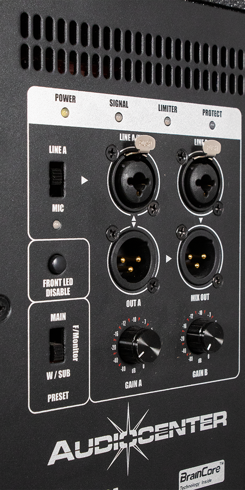 Posee dos entradas combo XLR/TRS, salidas independientes por canal y mezcla (MIX OUT), además de selector de voltaje 127/220V, sistema de enfriamiento activo y completo set de protecciones electrónicas. Su gabinete de madera contrachapada con recubrimiento de poliurea y rejilla metálica lo hacen resistente para trabajo rudo en giras y escenarios.