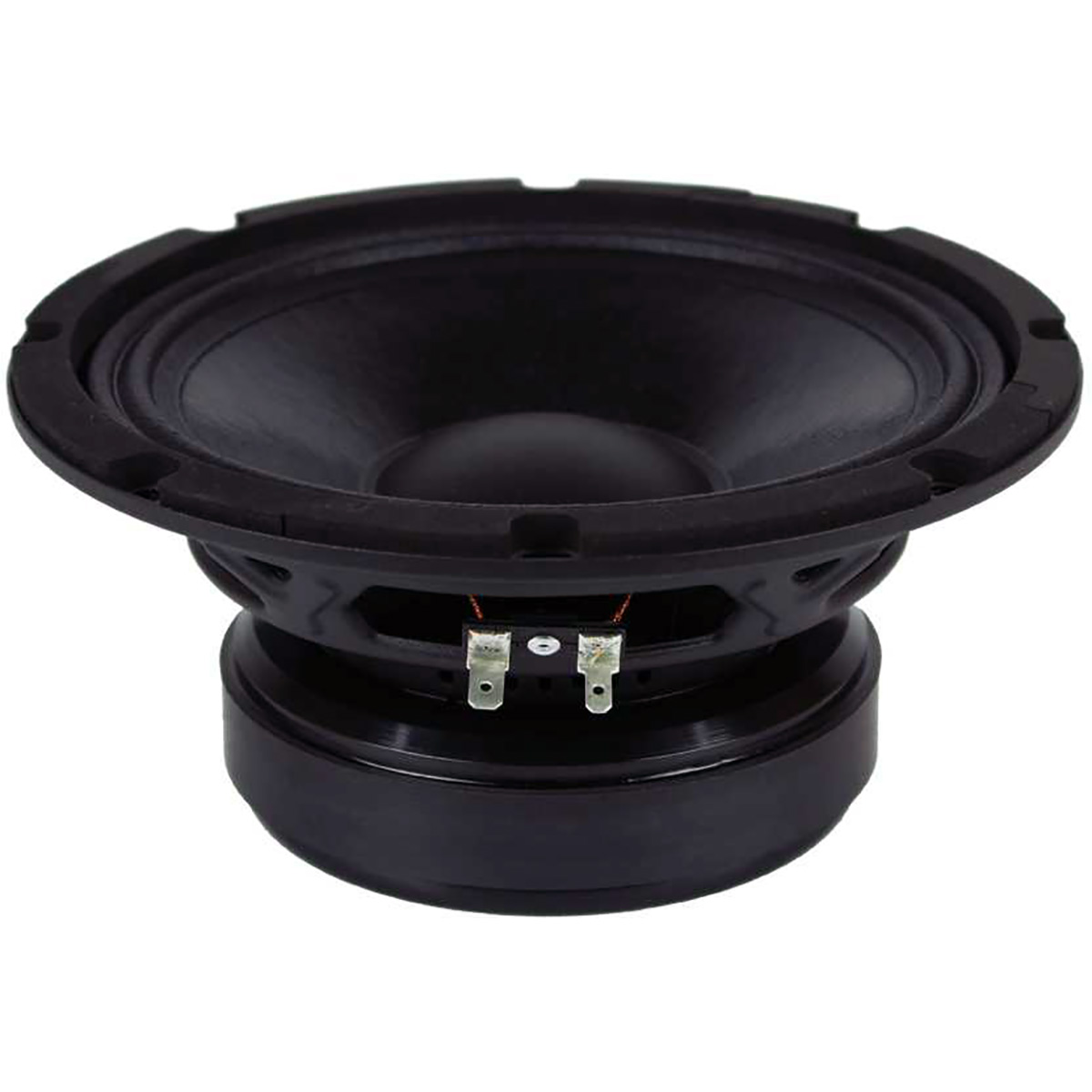 Altavoz de 8” pulgadas a 8 ohms con un manejo de potencia de 500 watts programa, bobina móvil de alambre de cobre de 2” pulgadas, alta sensibilidad de 95 dB (1W/1m), circuito magnético de cerámica optimizado FEA, diseñado con tecnología MMSS, baja distorsión armónica y respuesta lineal, cono a prueba de agua con tratamiento en ambos lados del cono, canasta de acero prensado optimizada, desplazamiento controlado extendido Xmax: ±6 mm, excursión pico a pico de 32 mm antes del daño, ideal para un amplio rango de aplicaciones de frecuencias graves y medias.