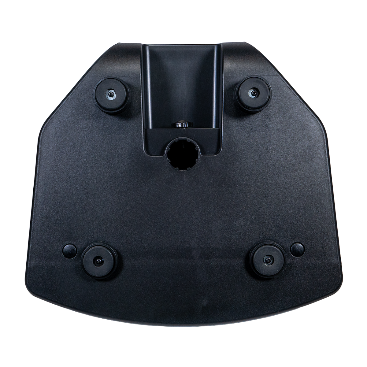El gabinete trapezoidal permite montaje en poste de 35 mm o uso como monitor de piso, e incorpora asas ergonómicas y puntos de montaje para facilitar su transporte e instalación. Opera con alimentación de 100–130V~ (±10%, 50/60 Hz) e incluye función de auto standby para ahorro energético.