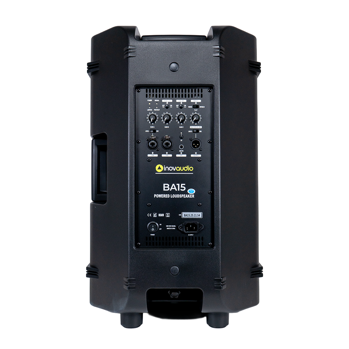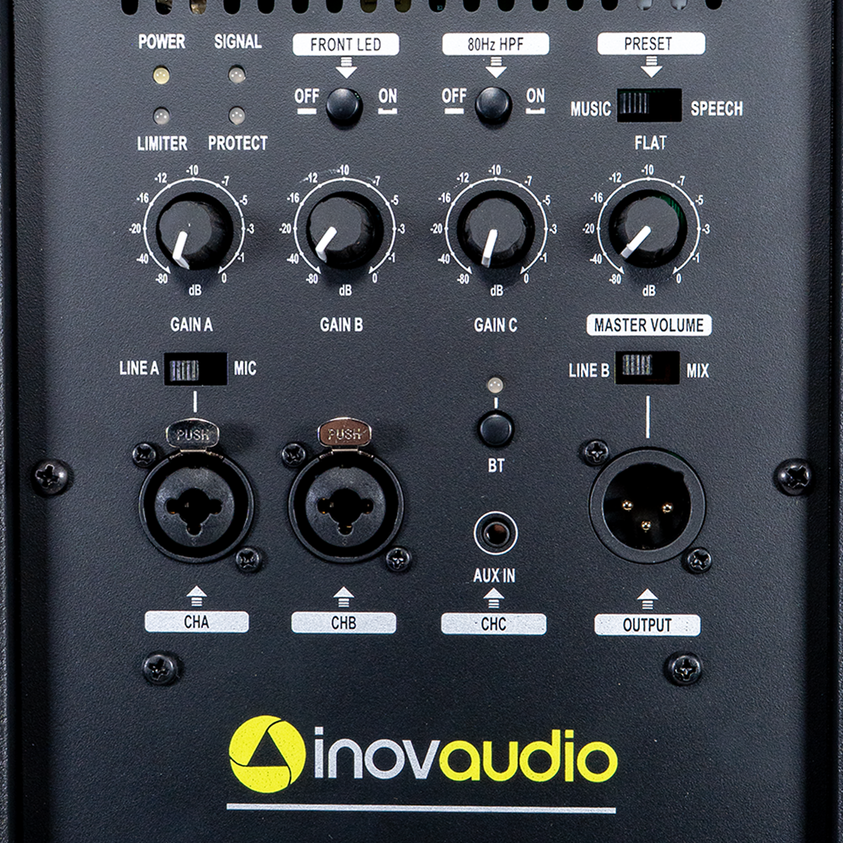 Incluye mezclador interno con dos entradas combo XLR/TRS, entrada auxiliar de 3.5 mm y conectividad Bluetooth, además de salida XLR con selector Line/Mix. Dispone de filtro pasa altas (HPF) a 80 Hz para integración con subwoofer, limitador interno y sistema de ventilación activa para mayor protección.