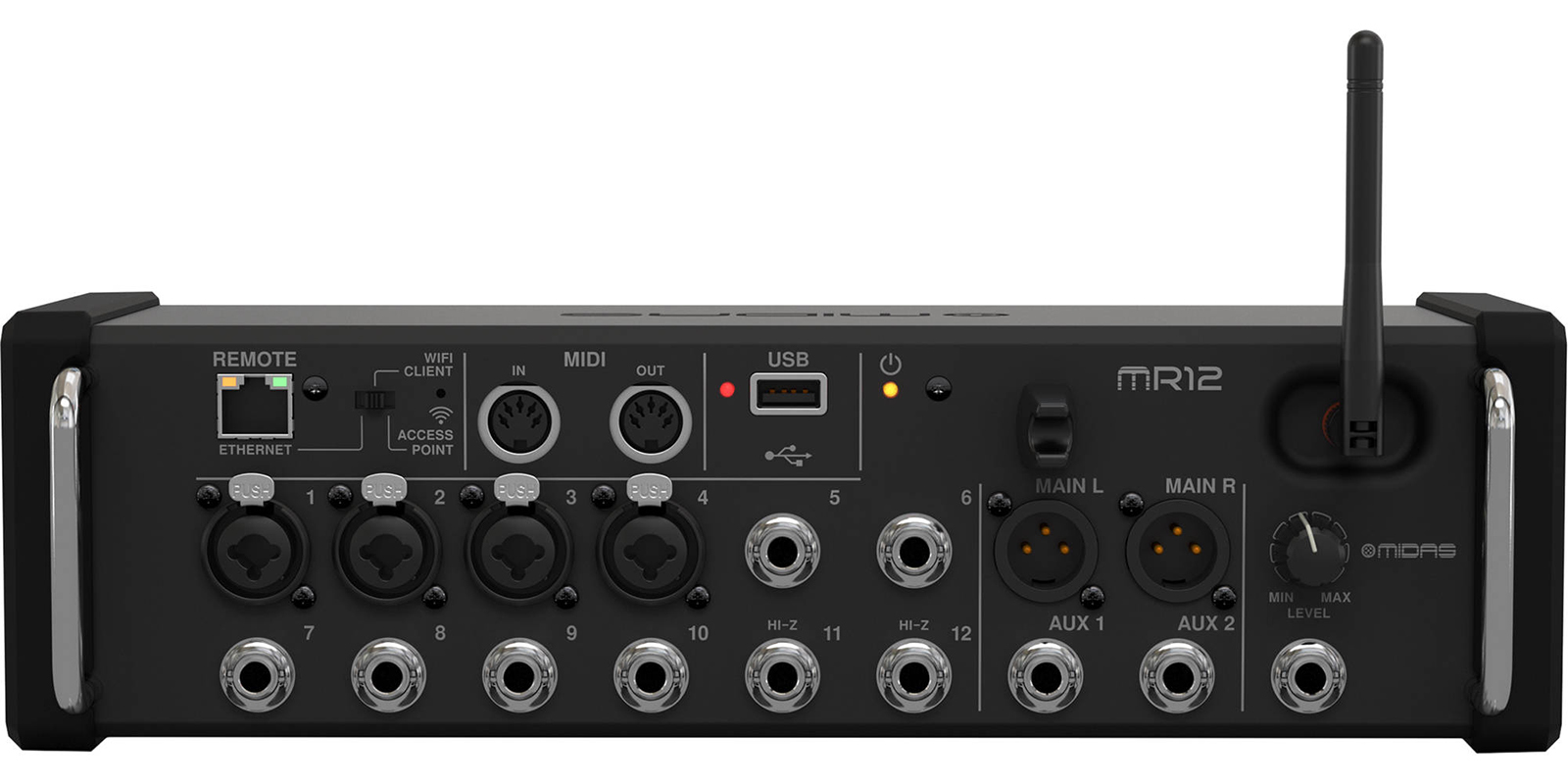 Los preamplificadores MIDAS PRO fueron desarrollados para las consolas de la serie PRO y se encuentran también en la M32 y han sido reconocidos por los ingenieros de sonido y grabación en vivo como la esencia misma del sonido MIDAS. Es aquí en la MR12 que más de 40 años de excelencia en el diseño se han unido con componentes de primera calidad para proporcionar calidez y profundidad sin precedentes, un ambiente sutil y un posicionamiento espacial inmaculado. El galardonado preamplificador de micrófono MIDAS ha inspirado a generaciones de ingenieros de audio en vivo a crear su mejor trabajo, creando paisajes sonoros que han cautivado audiencias en todo el mundo. La MR12 viene equipada con 4 preamplificadores MIDAS PRO, todas las cuales están literalmente listas para tus entradas a través de los conectores combinados Neutrik con pestillos de bloqueo.