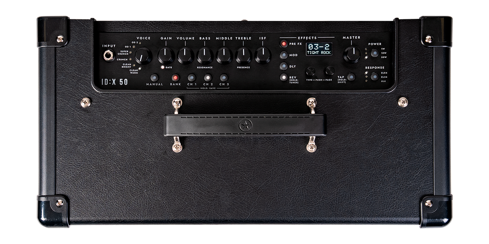 El IDX:50 también incorpora funciones avanzadas como la simulación de respuesta de válvulas (EL84, EL34 y 6L6) para emular el tacto y carácter de los amplificadores clásicos. Además, incluye salida directa CabRig mediante XLR balanceado, USB-C para grabación y entrada auxiliar para reproducción de audio.