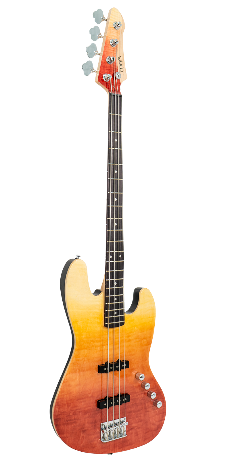 Bajo Eléctrico de 20 Trastes con Circuito Activo, Cuerpo de Álamo y Tapa de Arce Flameado, Mástil de Arce Canadiense y Diapasón de Palo Santo