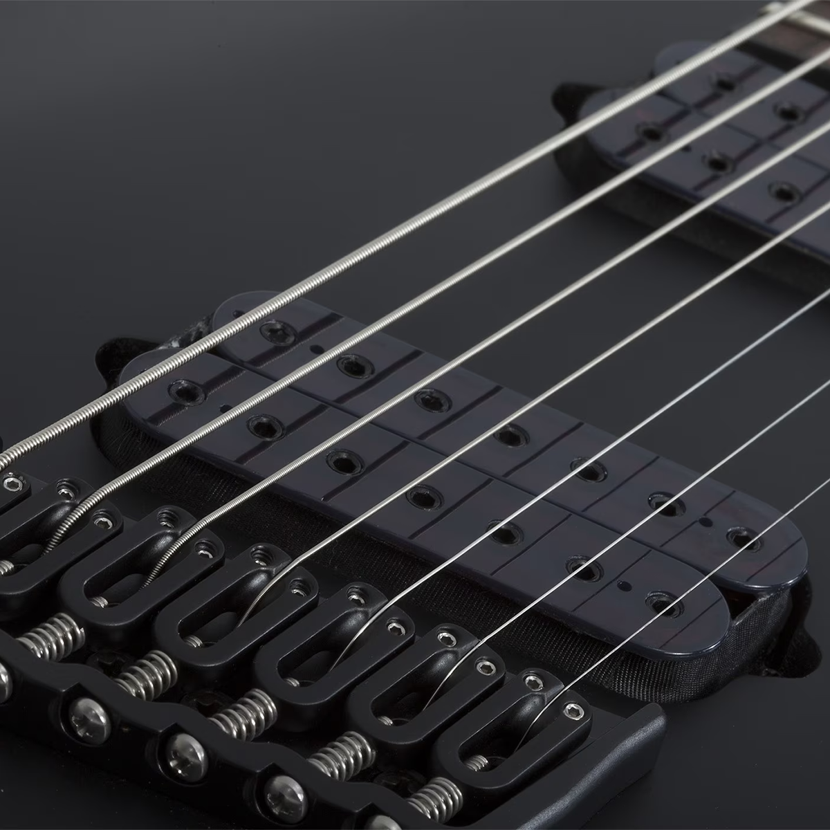 La escala multiescala de 25.5″ a 27″ mejora la tensión de las cuerdas graves, evitando la pérdida de definición en afinaciones descendidas. Su perfil de mástil Thin “C”, junto con el radio de 16″ y los 24 trastes jumbo, ofrece una ejecución cómoda tanto para acordes amplios como para solos técnicos. El diapasón de palisandro con incrustaciones “Grey Pearloid Bats” añade una estética moderna y distintiva, mientras que la cejuela Graph Tech XL Black Tusq asegura una afinación precisa y un deslizamiento suave de las cuerdas.