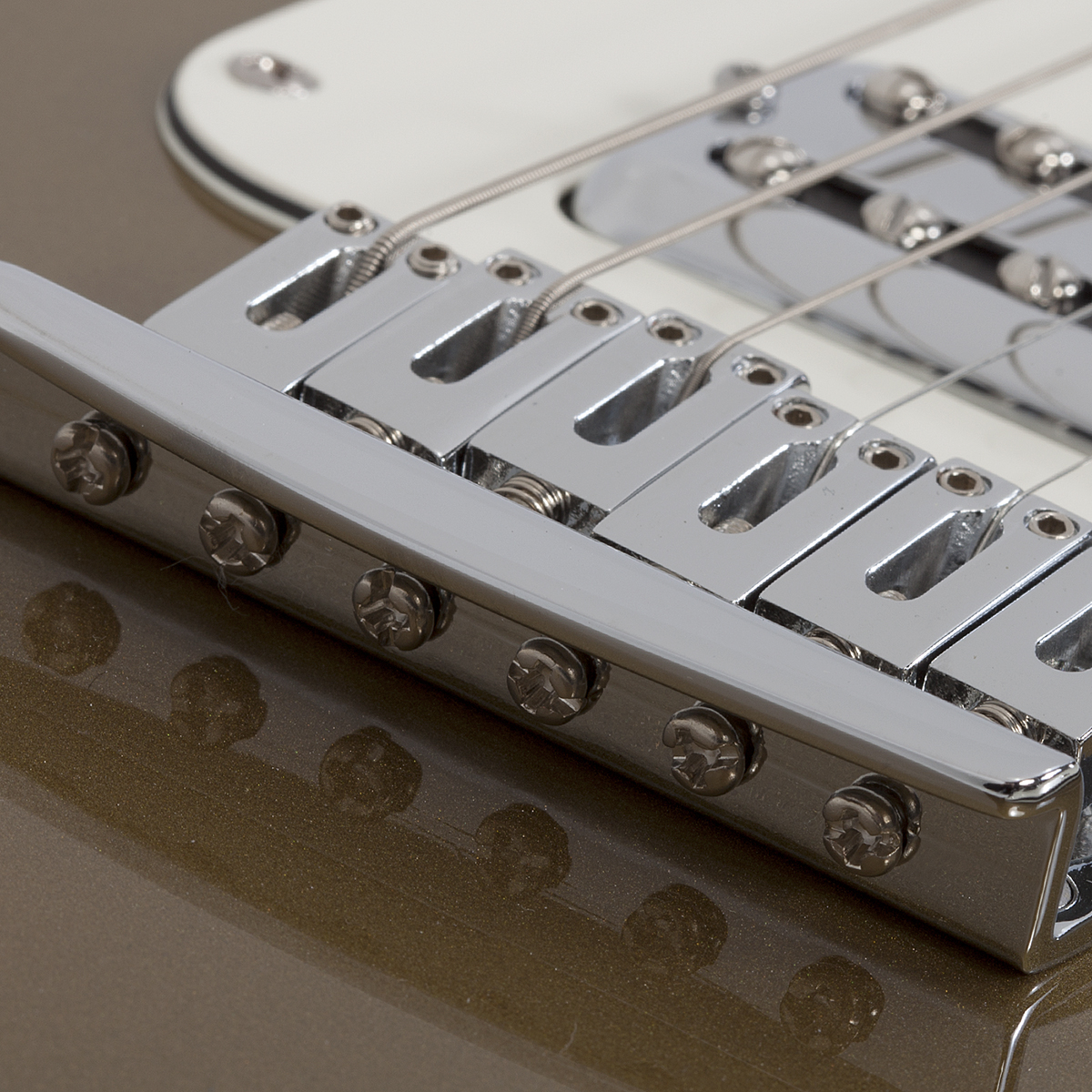 Guitarra eléctrica solida, cuerpo de caoba, tapa plana, hardware cromado, construcción bolt-on, unión: marfil, una capa, puente: Diamond Hardtail, maquinaria Grover, brazo C delgado de maple, diapasón de ébano de 14″ pulgadas (355 mm) de radio, 22 trastes X-Jumbo, incrustaciones de bloques, escala: 25.5” (648 mm), espesor en el primer traste: .787” (20 mm) y en el traste 12: .866” (22 mm), cejuela de Graph Tech XL Ivory Tusq de 1.653” (42 mm) de ancho, alma ajustable de 2 vías con tuerca Allen de 5/32” (4 mm), dos volúmenes y dos tonos (Push-Pull), selector de tres posiciones, pastilla del puente: Schecter Diamond UltraTron, pastilla del brazo: Schecter Diamond UltraTron, perillas tipo campana.