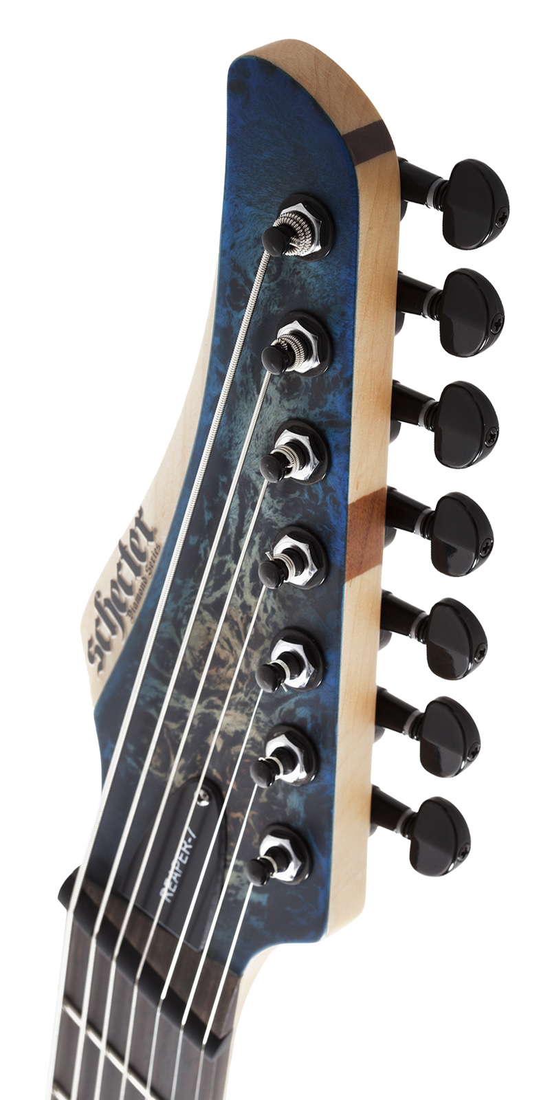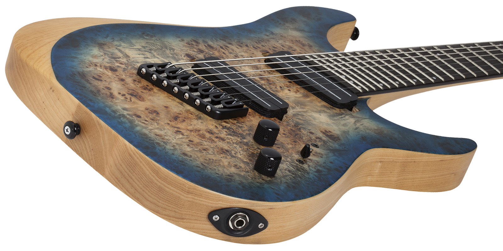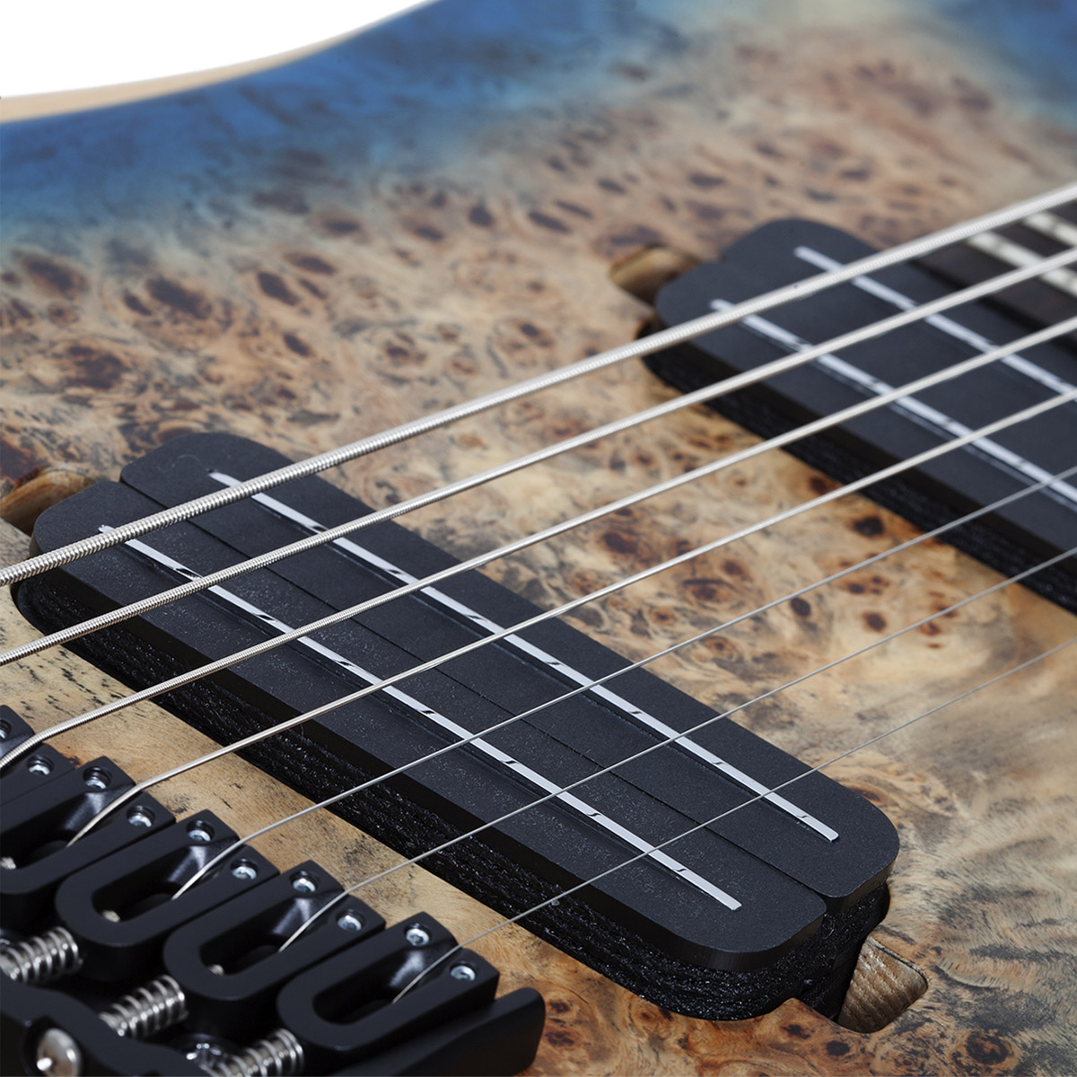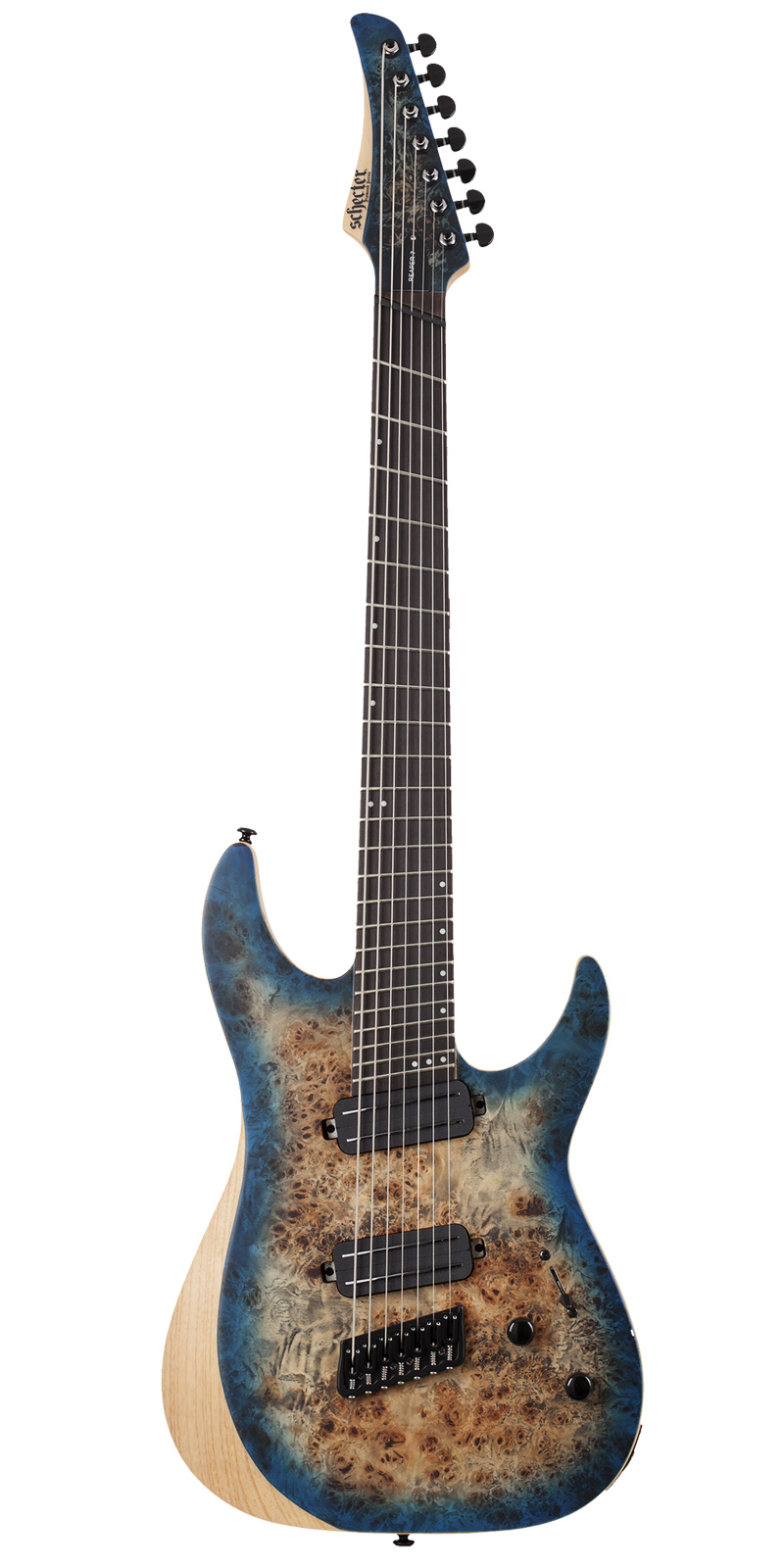 Guitarra eléctrica sólida de 7 cuerdas, cuerpo de fresno de pantano, tapa plana de madera burl, hardware negro y cromado, construcción: Set-Neck con Ultra Access, puente Hipshot Hardtail (.125) con String Thru Body, maquinaria Schecter, brazo C ultra delgado de Maple/Nogal Multi-capa con varillas de refuerzo de fibra de carbono, diapasón de ébano, incrustaciones: Pearloid Offset y puntos inversos, escala: 25.5”- 27″ (648 mm – 685.8 mm), 24 trastes Narrow X-Jumbo, cejuela de grafito de 1.889” (48 mm) de ancho, alma ajustable de 2 vías con tuerca Allen de 5/32” (4 mm), un volumen y un tono (Push-Pull), selector de 3 posiciones, pastilla del puente: Schecter Diamond Decimator, pastilla del brazo: Schecter Diamond Decimator, perillas de metal moleteado con tornillo de ajuste.