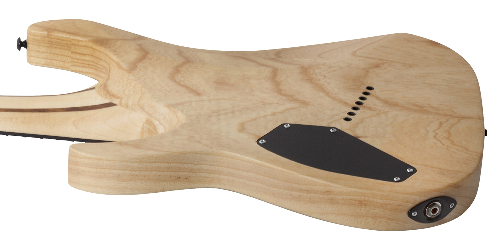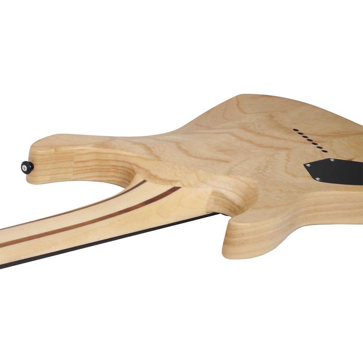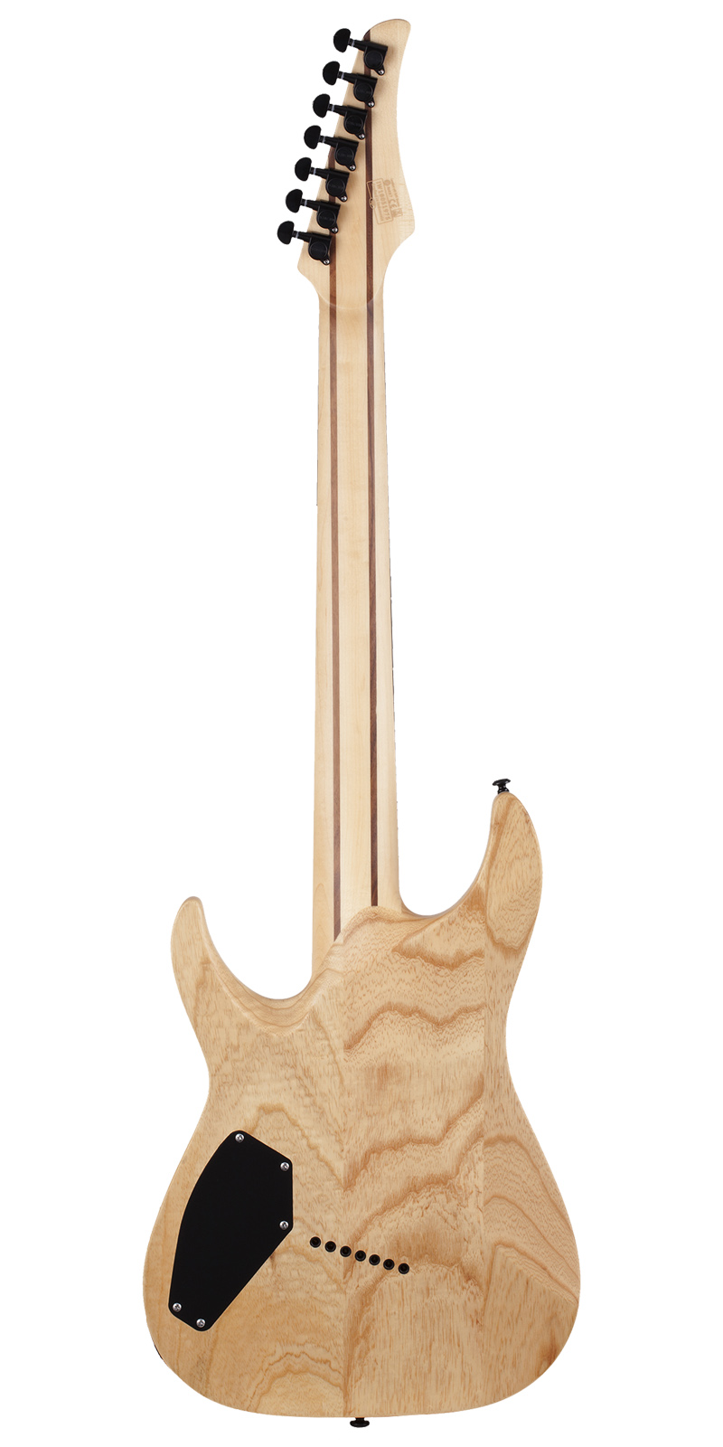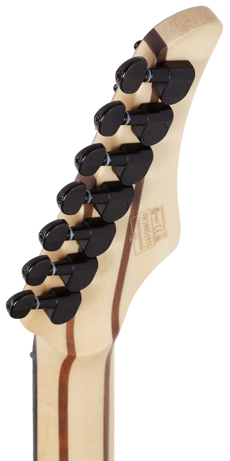 Guitarra eléctrica sólida de 7 cuerdas, cuerpo de fresno de pantano, tapa plana de madera burl, hardware negro y cromado, construcción: Set-Neck con Ultra Access, puente Hipshot Hardtail (.125) con String Thru Body, maquinaria Schecter, brazo C ultra delgado de Maple/Nogal Multi-capa con varillas de refuerzo de fibra de carbono, diapasón de ébano, incrustaciones: Pearloid Offset y puntos inversos, escala: 25.5”- 27″ (648 mm – 685.8 mm), 24 trastes Narrow X-Jumbo, cejuela de grafito de 1.889” (48 mm) de ancho, alma ajustable de 2 vías con tuerca Allen de 5/32” (4 mm), un volumen y un tono (Push-Pull), selector de 3 posiciones, pastilla del puente: Schecter Diamond Decimator, pastilla del brazo: Schecter Diamond Decimator, perillas de metal moleteado con tornillo de ajuste.