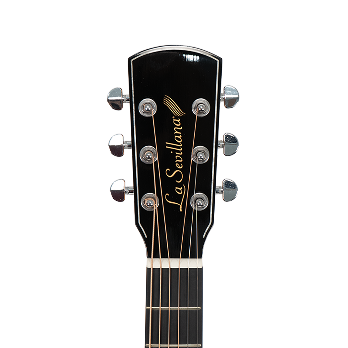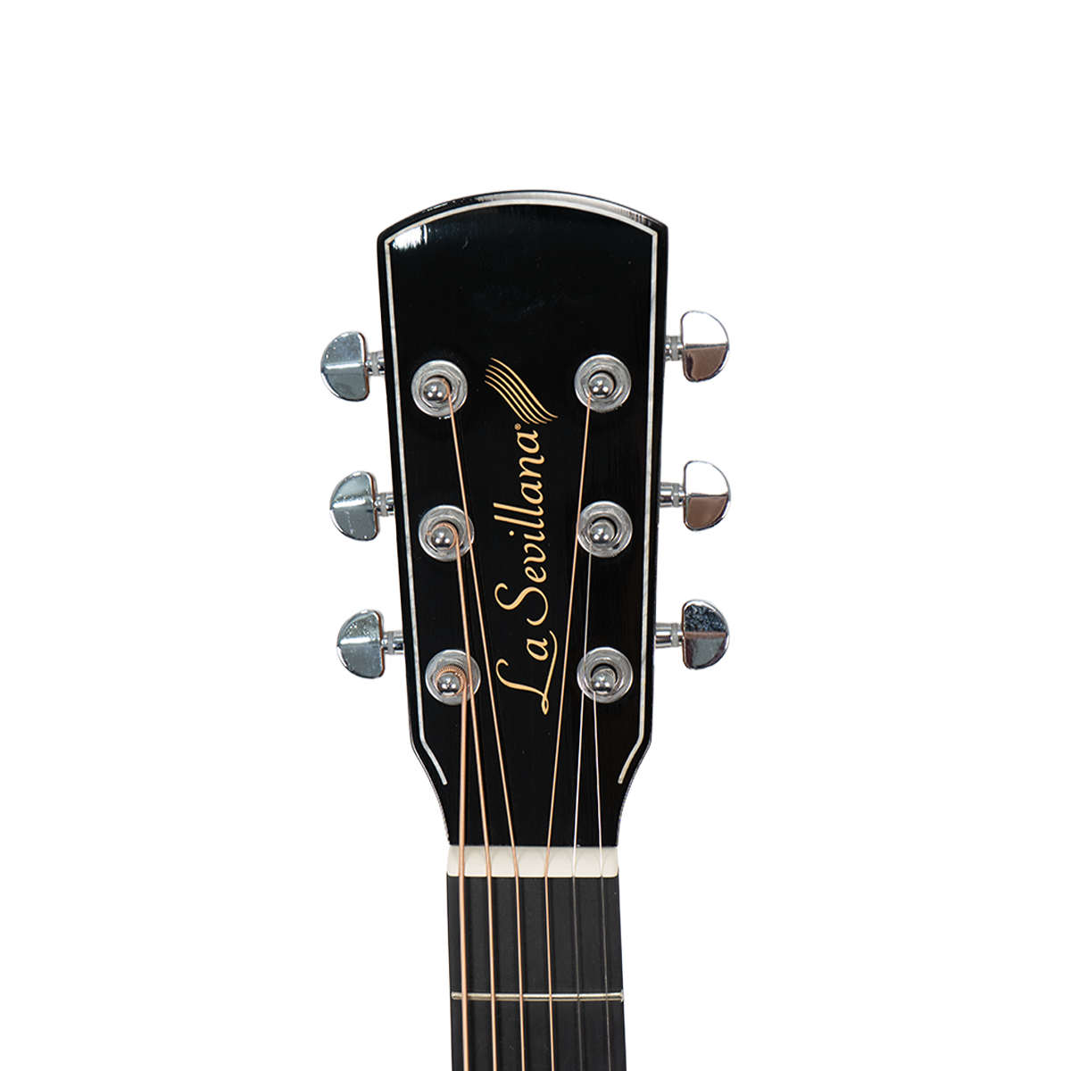 El mástil de caoba con perfil Modern D proporciona un agarre cómodo y ergonómico, ideal para rasgueos y ejecución precisa. Está equipado con un diapasón de palorrosa de radio 12″, que facilita la movilidad de los dedos sobre sus 20 trastes, mientras que la cejuela plástica de 43 mm y el truss rod doble permiten ajustes finos de curvatura y acción. La escala de 596 mm asegura una tensión equilibrada, favoreciendo comodidad y claridad en el sonido.