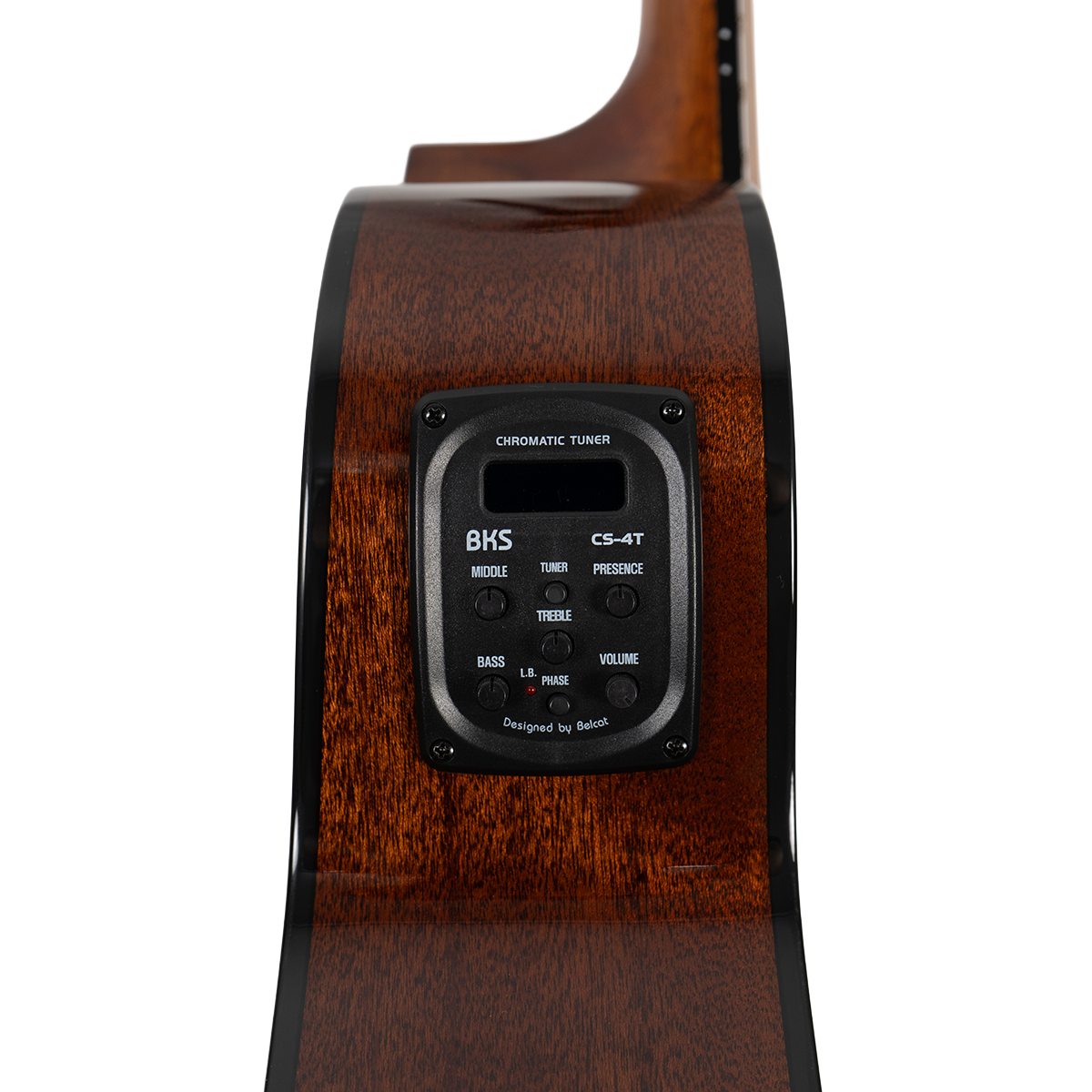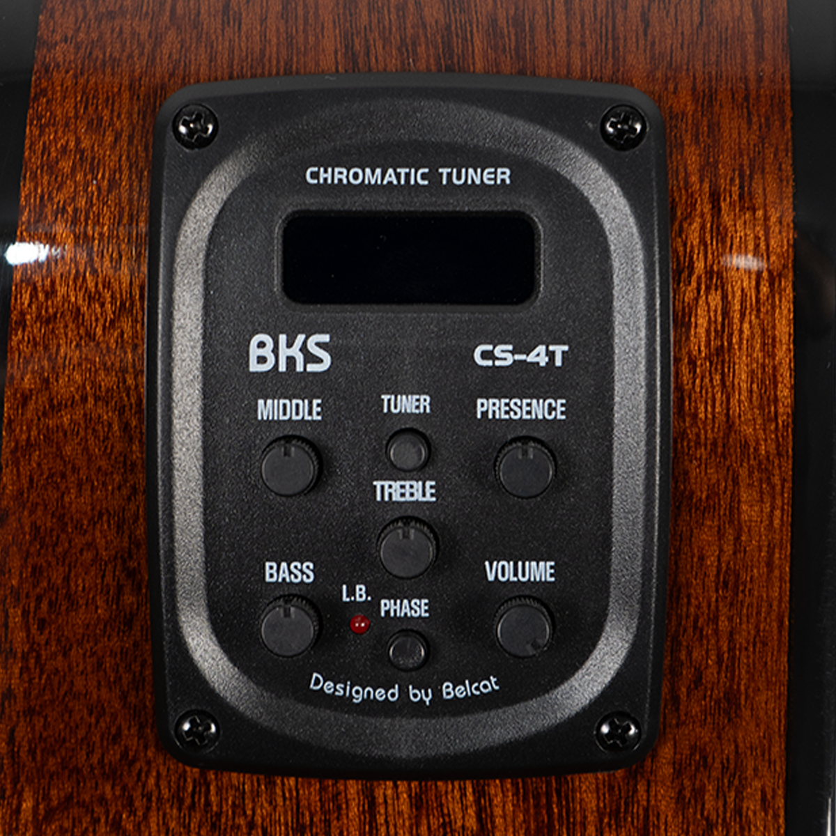 Cuenta con un preamplificador de 4 bandas y pastilla piezoeléctrica en el saddle (cerámica), que ofrece controles de bajo, medio, agudo y fase, permitiendo moldear el sonido de manera precisa y capturando fielmente la resonancia del cuerpo.