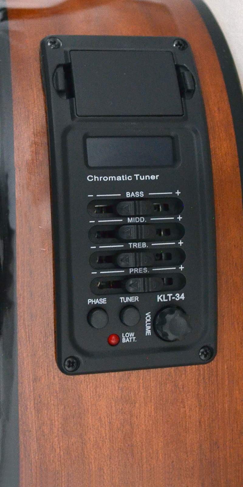 Guitarra electro acústica, canto delgado, resaque, tapa de abeto, brazo de nato, aros y fondo de caoba, diapasón de palo de rosa, puente de sonokeling, color natural, preamp activo KLT-34 con afinador digital, ecualizador de 4 bandas, volumen y fase, cuerdas D´Addario de acero.