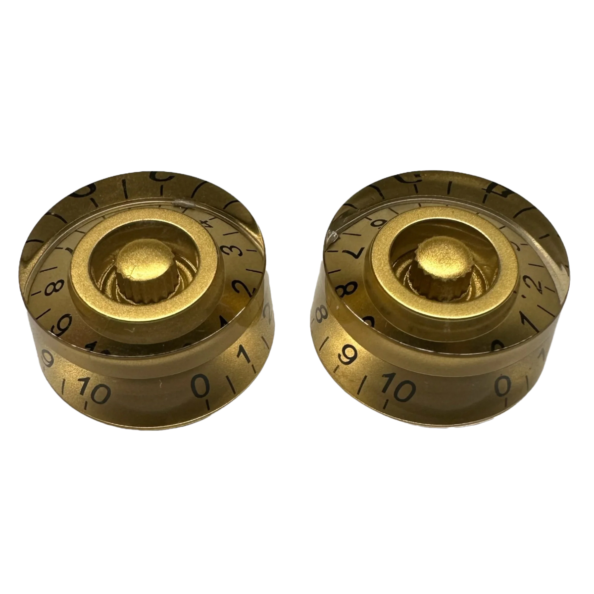 Estas perillas de plástico clásicas para guitarras estilo Gibson ® Se adapta a ejes de olla de 18 estrías. Se vende en juegos de 2 pomos.