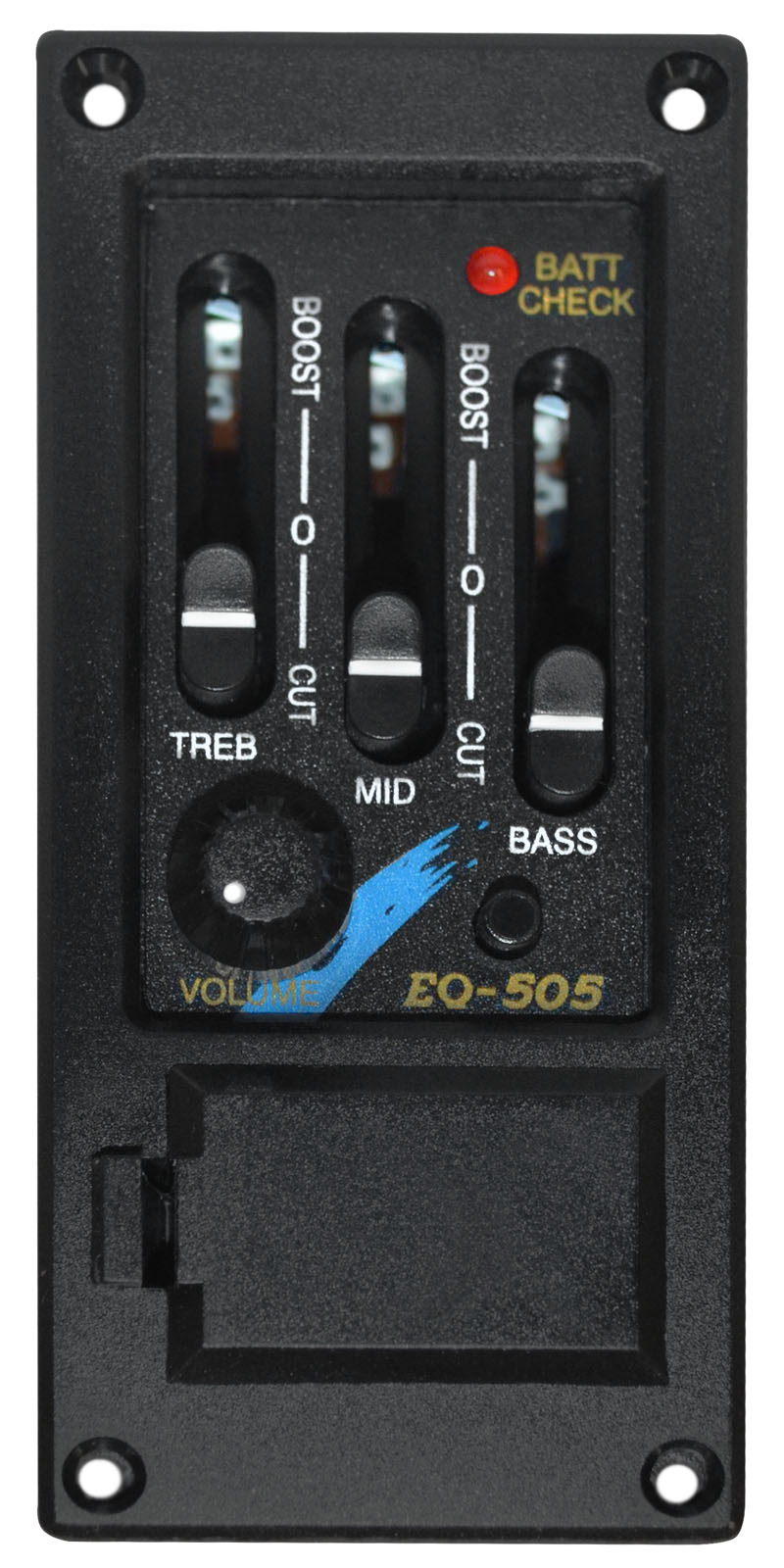 El EQ505 de Belcat es un preamplificador para guitarra Western con un ecualizador que controla graves, medios y agudos (+/- 12 dB cada uno). Cuenta con un rango de frecuencia de 20 Hz – 20 kHz, control de volumen, interruptor de corte de sonido y LED para estado de batería. Incluye pastilla piezoeléctrica y jack endpin.