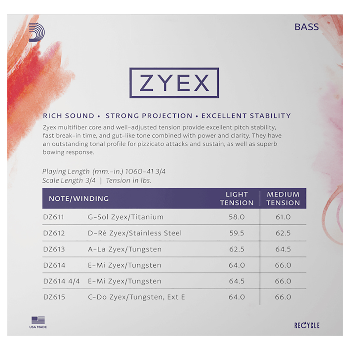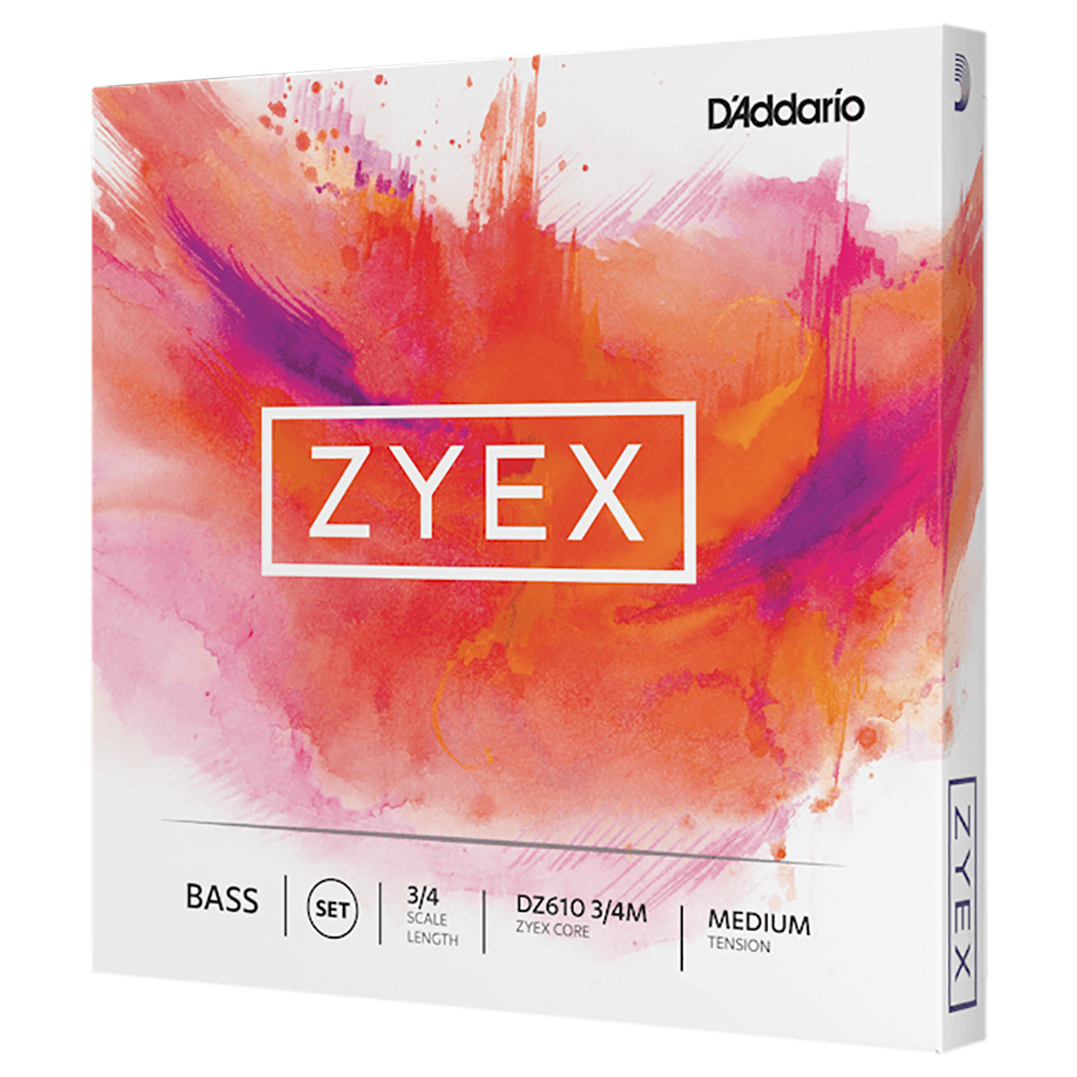 Juego de cuerdas Zyex de D´Addario para contrabajo, escala 3/4, tensión media, aptas para contrabajos de 3/4 con una longitud de 41 3/4 pulgadas (1,060 mm), núcleo sintético Zyex, sonido extremadamente cálido y profundo, material sintético de última generación, increíblemente estables en condiciones climáticas adversas, ataques de pizzicato y efectos sostenidos sobresalientes, excelente respuesta del arco.