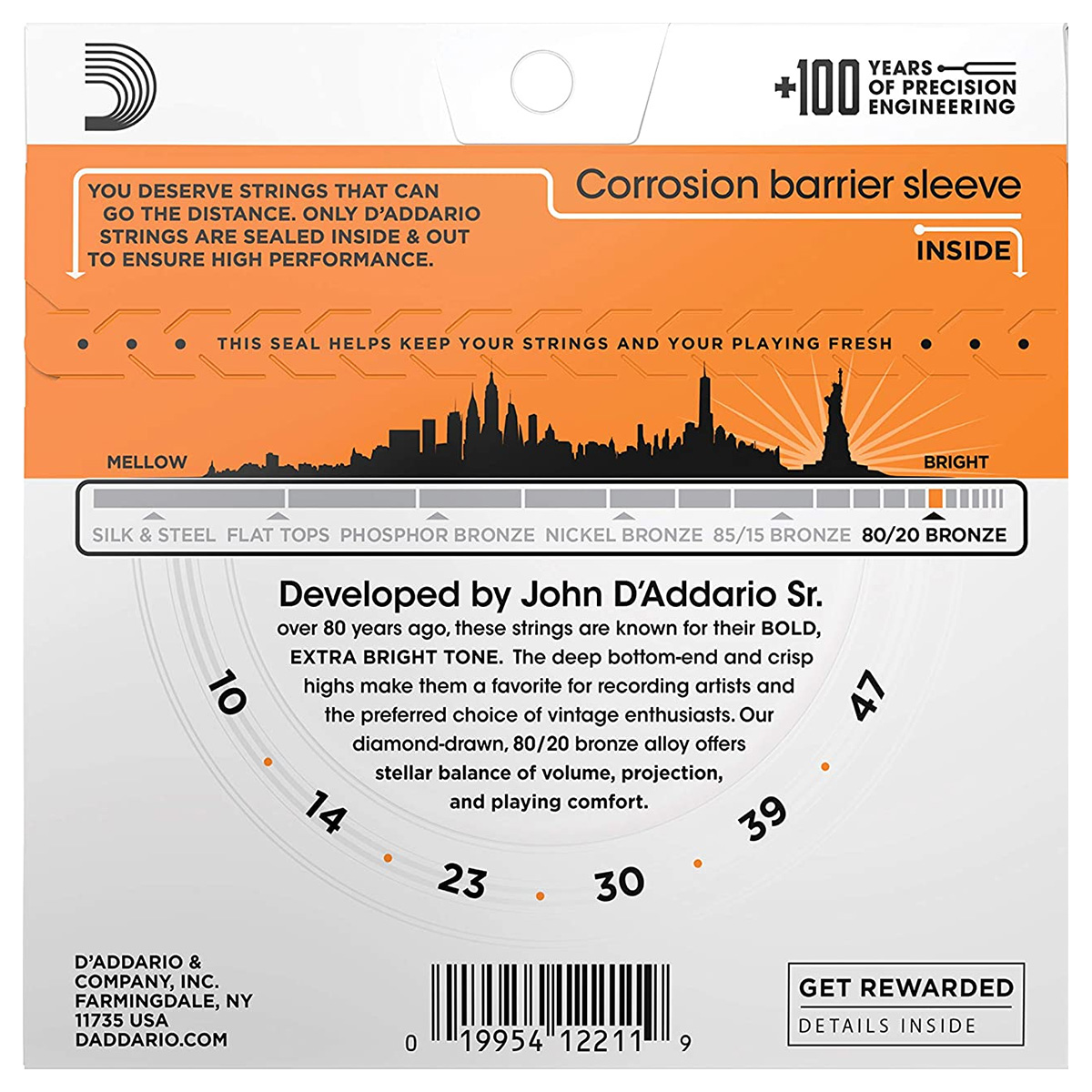 El bronce 80/20, comúnmente llamado latón, es la aleación original para cuerdas de guitarra acústica seleccionada por John D´Addario Sr. y John D´Angelico en la década de 1930. Las cuerdas de bronce 80/20 son populares para grabación por su tono crujiente, profundo y con proyección, y atraen a muchos tradicionalistas y aficionados de lo clásico por su significación histórica. Todas las cuerdas para guitarra acústica de D´Addario se entorchan sobre un núcleo de acero de alto carbono con forma hexagonal, lo que crea un tono billante y duradero con excelente entonación.