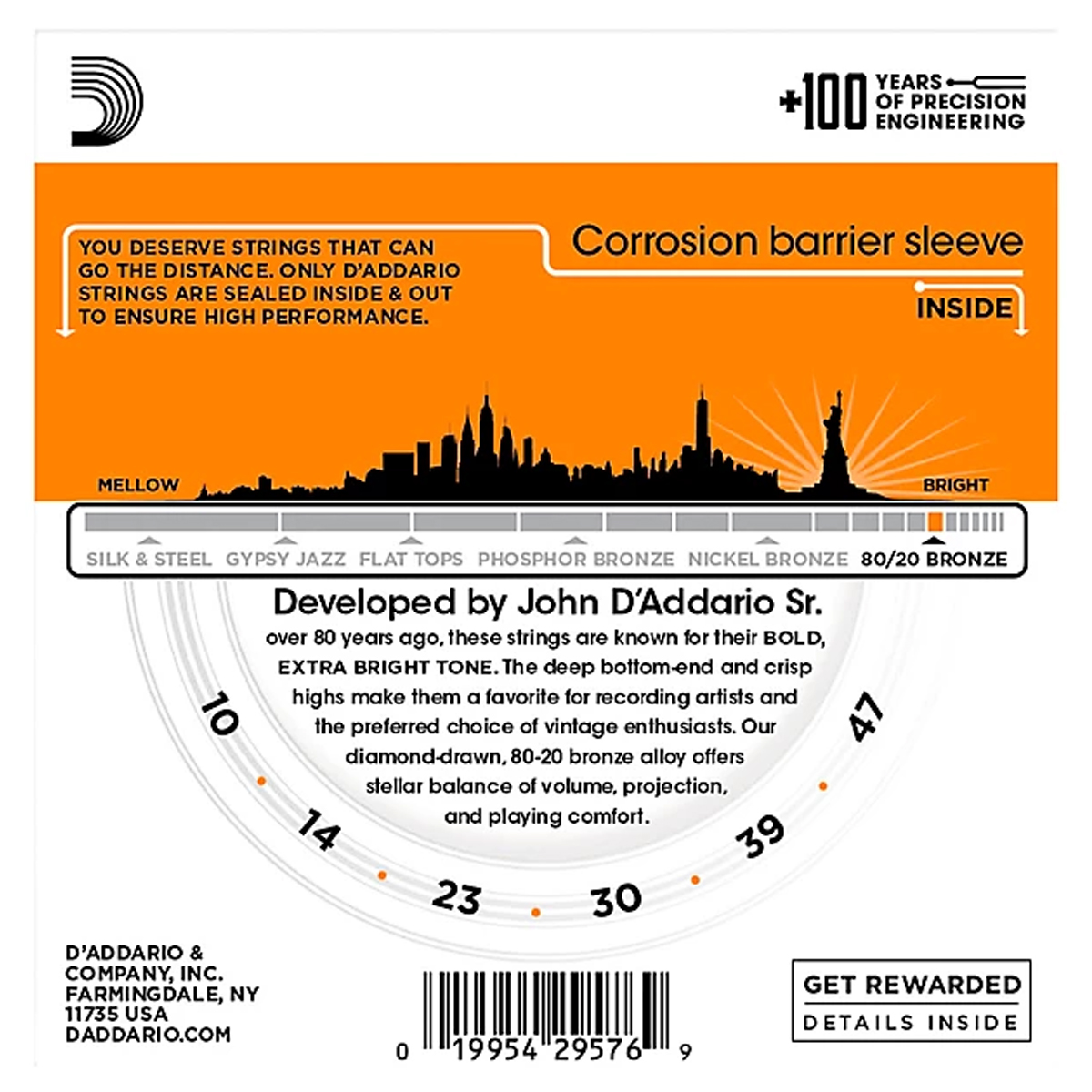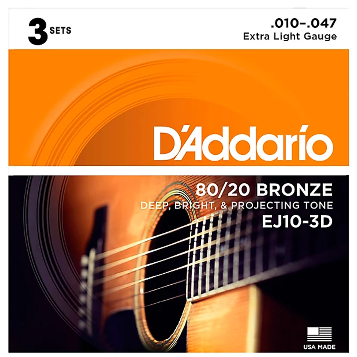 Cuerdas para guitarra acústica extra ligeras D´Addario EJ10-3D 80/20 bronce – 3 juegos 10 – 47