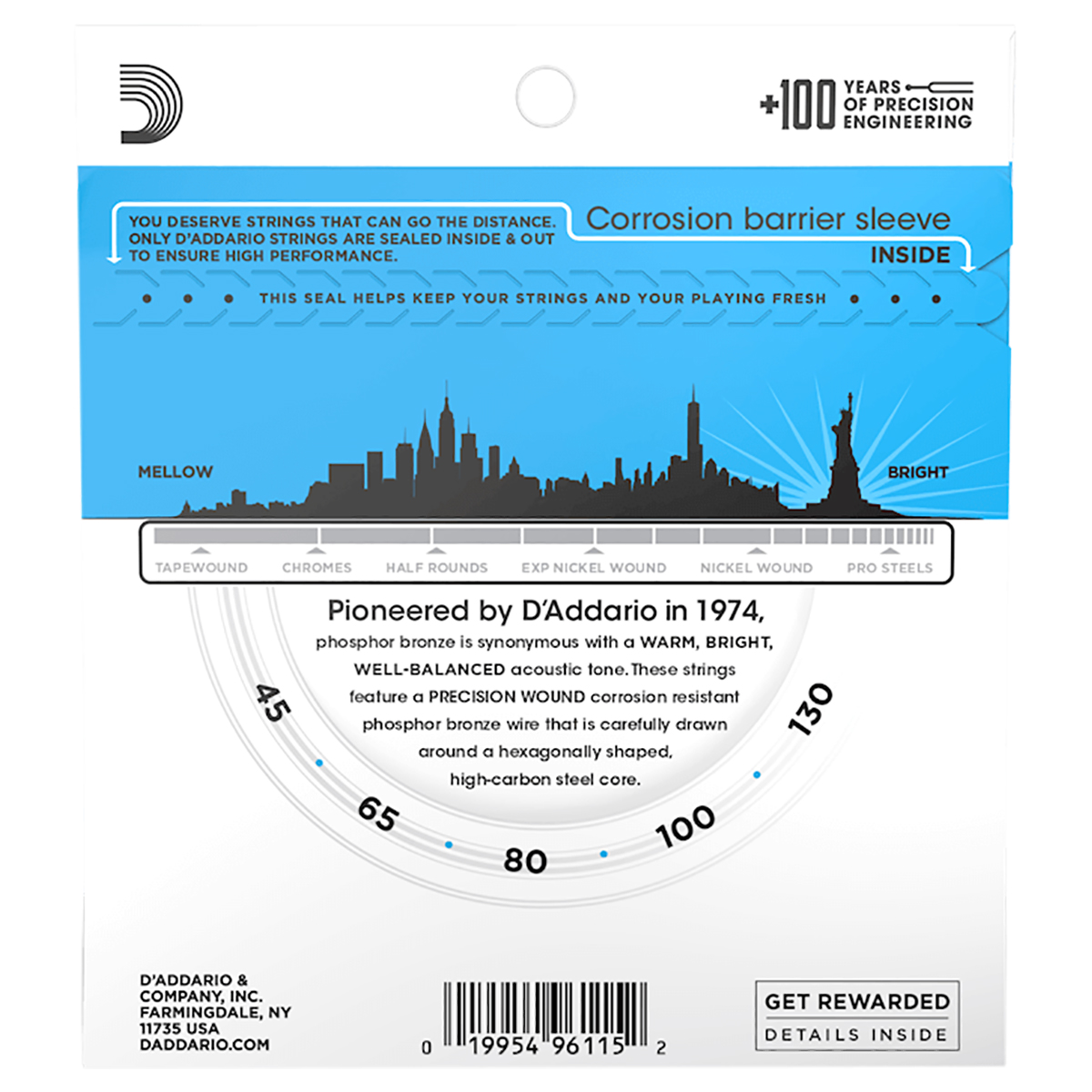 El bronce fosforado fue introducido para la fabricación de cuerdas por D´Addario en 1974 y se ha convertido en un sinónimo de calidez, nitidez y tono acústico bien equilibrado. Las cuerdas de bronce fosforado de D´Addario poseen un entorchado de precisión con bronce fosforado resistente a la corrosión sobre una cuerda de acero de alto carbono, con forma hexagonal y estirada cuidadosamente. El resultado es un tono brillante y duradero con excelente entonación.