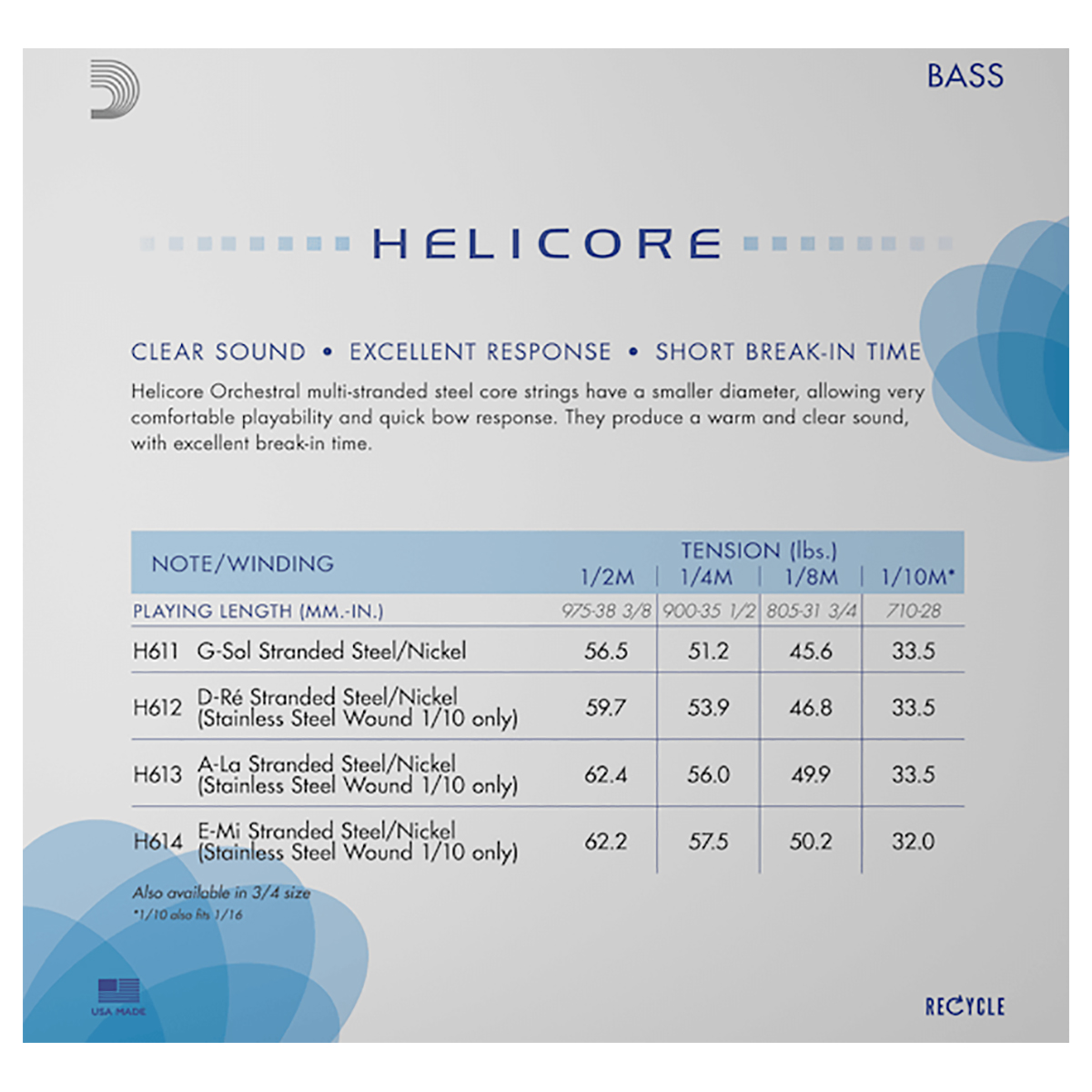 Las cuerdas para contrabajo Helicore, serie de orquesta, son cuerdas con núcleo de acero multitrenzado que producen una calidad de tono cálido y una excelente respuesta del arco. El diseño del núcleo permite que las cuerdas sean más fáciles de manipular con la mano izquierda. La amortiguación está optimizada para el uso de arco, aunque también funcionan bien para pizzicato, cuando se desea un sonido cálido menos sostenido.