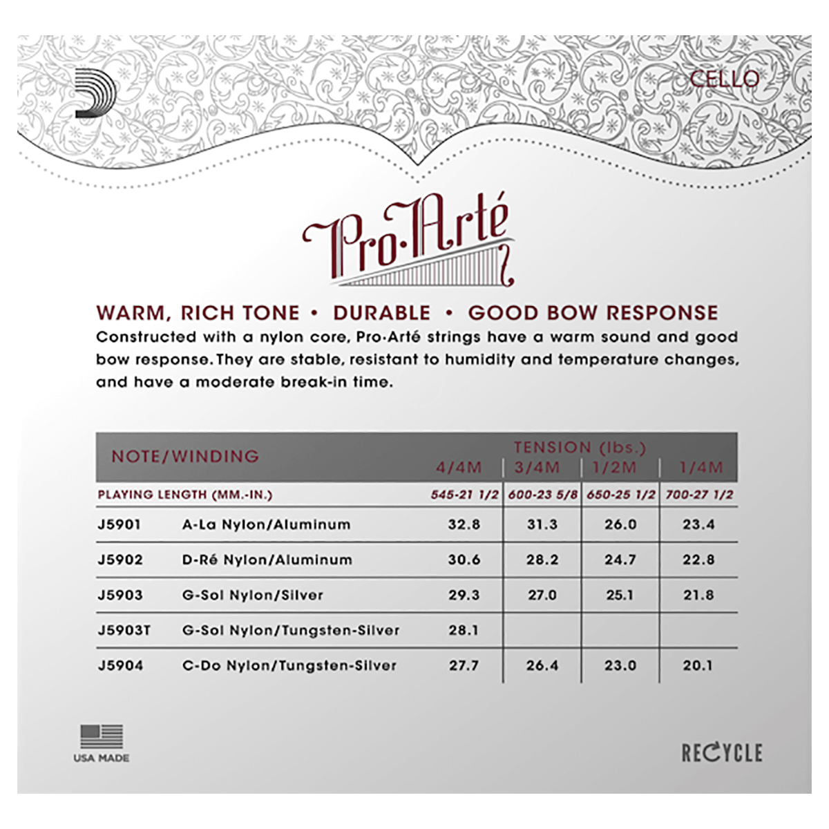 Las cuerdas para violonchelo con núcleo sintético de Pro-Arte ofrecen un tono cálido y melodioso. Son menos sensibles a los cambios de humedad y temperatura, y permiten un acostumbramiento rápido. Las cuerdas Pro-Arte están fabricadas con una menor tensión para maximizar la respuesta del arco, la combinación tonal y la facilidad de uso. La opción perfecta para músicos que buscan un tono cálido y oscuro.