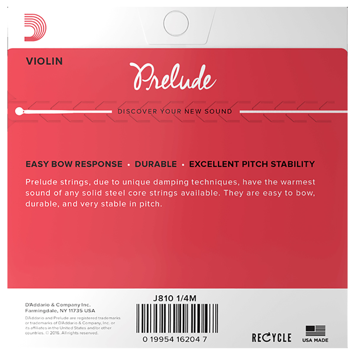 Las cuerdas para violín Prelude están fabricadas con un núcleo de acero sólido. Inalteradas por los cambios de temperatura y humedad, ofrecen una excelente respuesta del arco. Las cuerdas Prelude emiten el sonido más cálido disponible en un diseño de cuerda económico con núcleo de acero sólido. Prelude es la opción de cuerdas preferida por los profesores de música para sus estudiantes por la combinación exclusiva de tono cálido, durabilidad y valor que ofrecen.