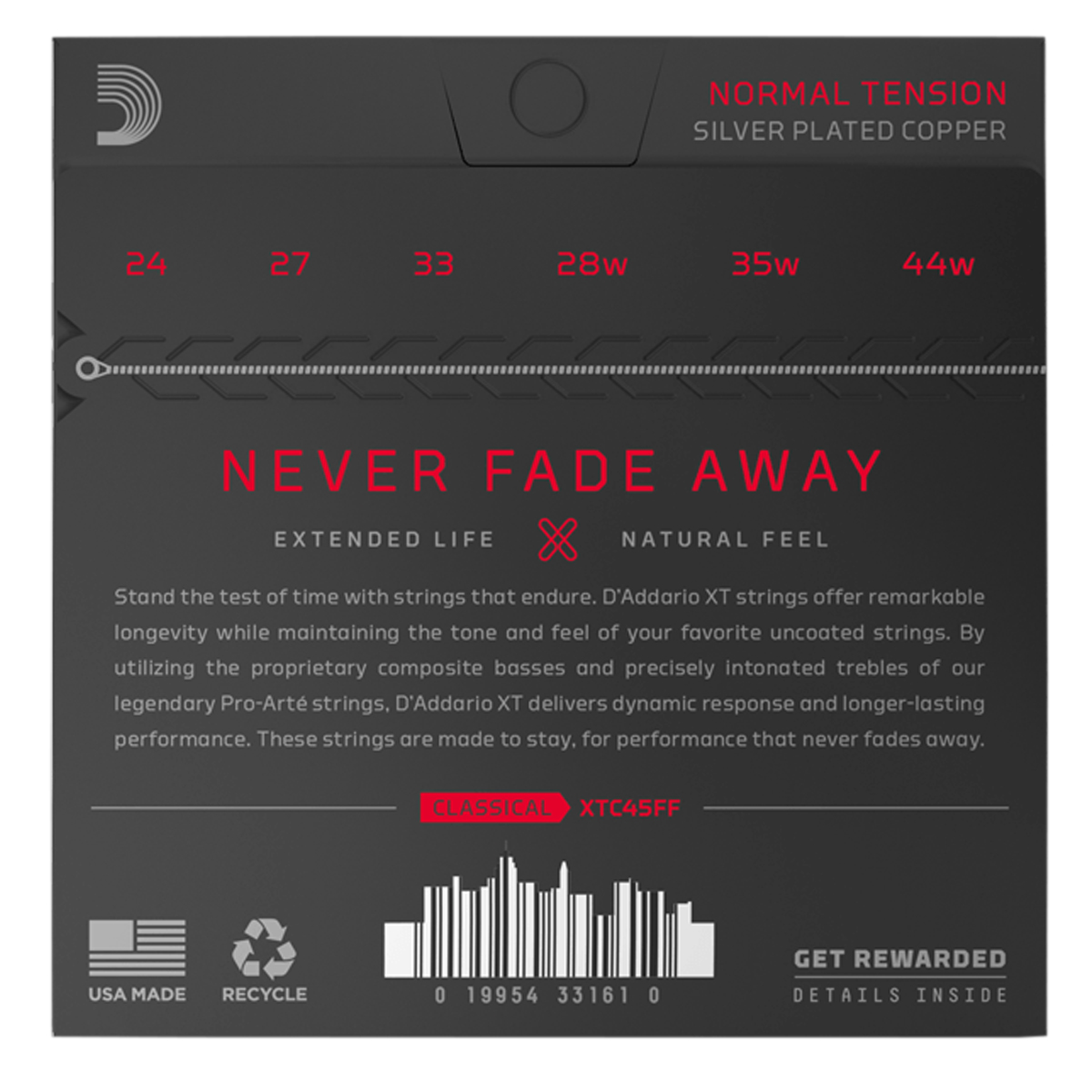 Las cuerdas clásicas XT Dynacore cuentan con un tratamiento avanzado de resistencia a la corrosión en cada cuerda entorchada del juego, preservando el tono natural y la sensación de las cuerdas sin recubrimiento. Utilizando nuestros bajos Dynacore patentados y agudos de titanio Pro-Arté entonados con precisión, las cuerdas XT Dynacore brindan una respuesta magníficamente dinámica y un tono puramente clásico. Este juego cuenta con bridas, material de monofilamento de titanio y alambre envolvente de cobre plateado. Las cuerdas de guitarra D´Addario XT Dynacore vienen con un código en la bolsa VCI reciclable y resellable, que puedes registrar para ganar puntos Players Circle. Nuestras cuerdas clásicas XT Dynacore se fabrican en los EE. UU. y se elaboran según especificaciones exactas en nuestras instalaciones de producción de Nueva York.