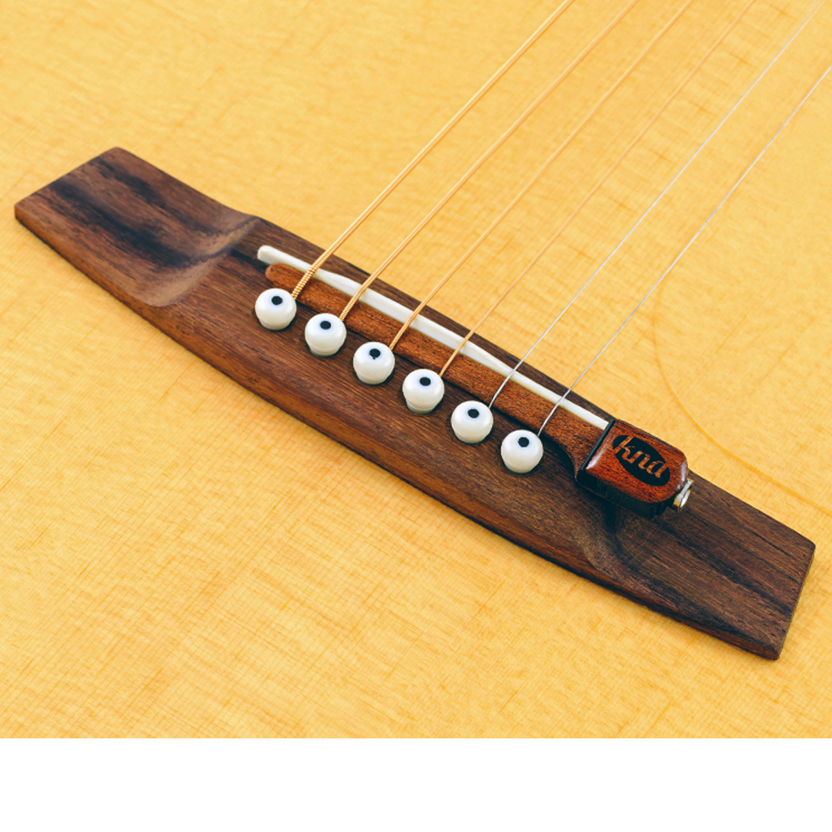 SG-1 se instala de forma segura en el bloque del puente de tu guitarra acústica, utilizando la tensión de las cuerdas para su sujeción.