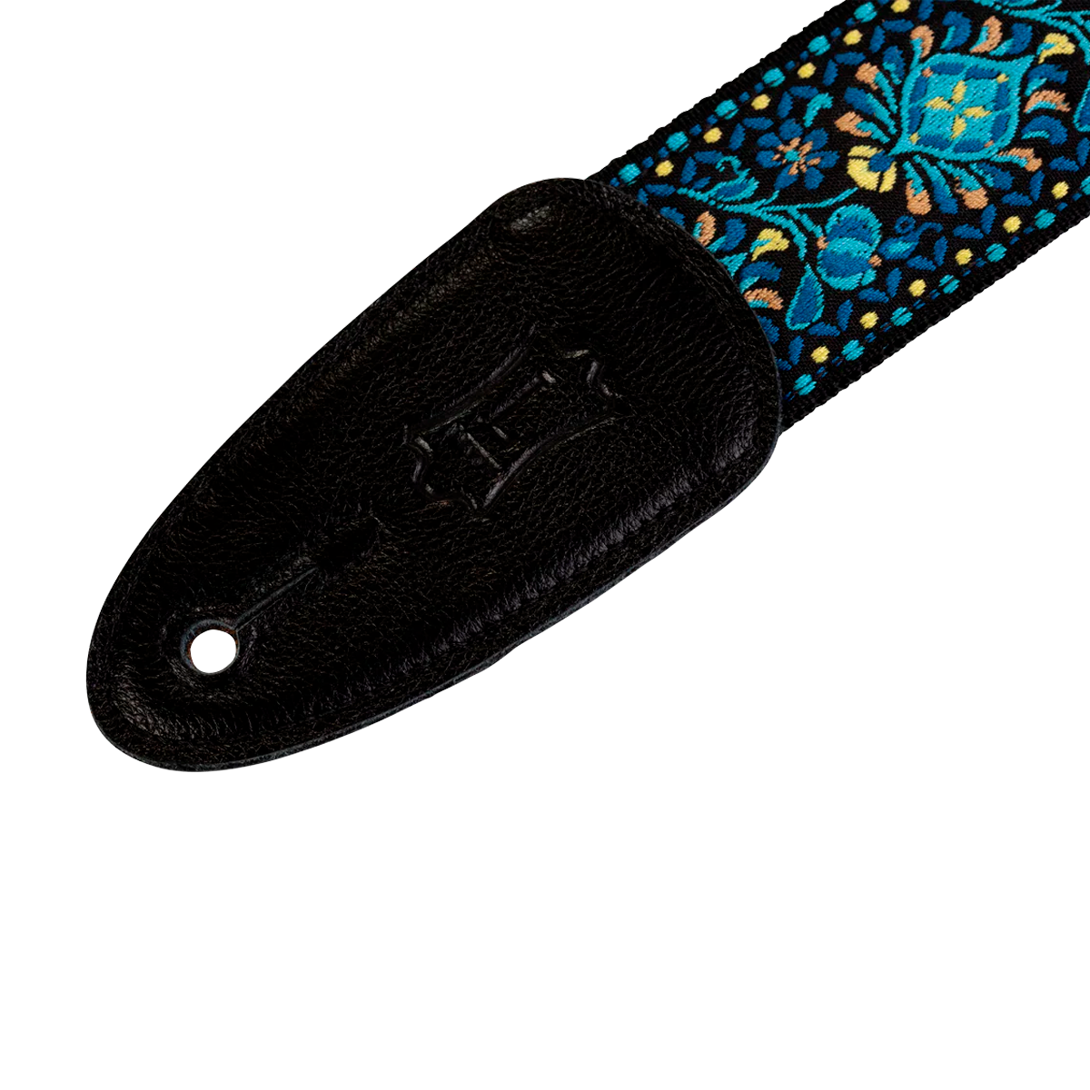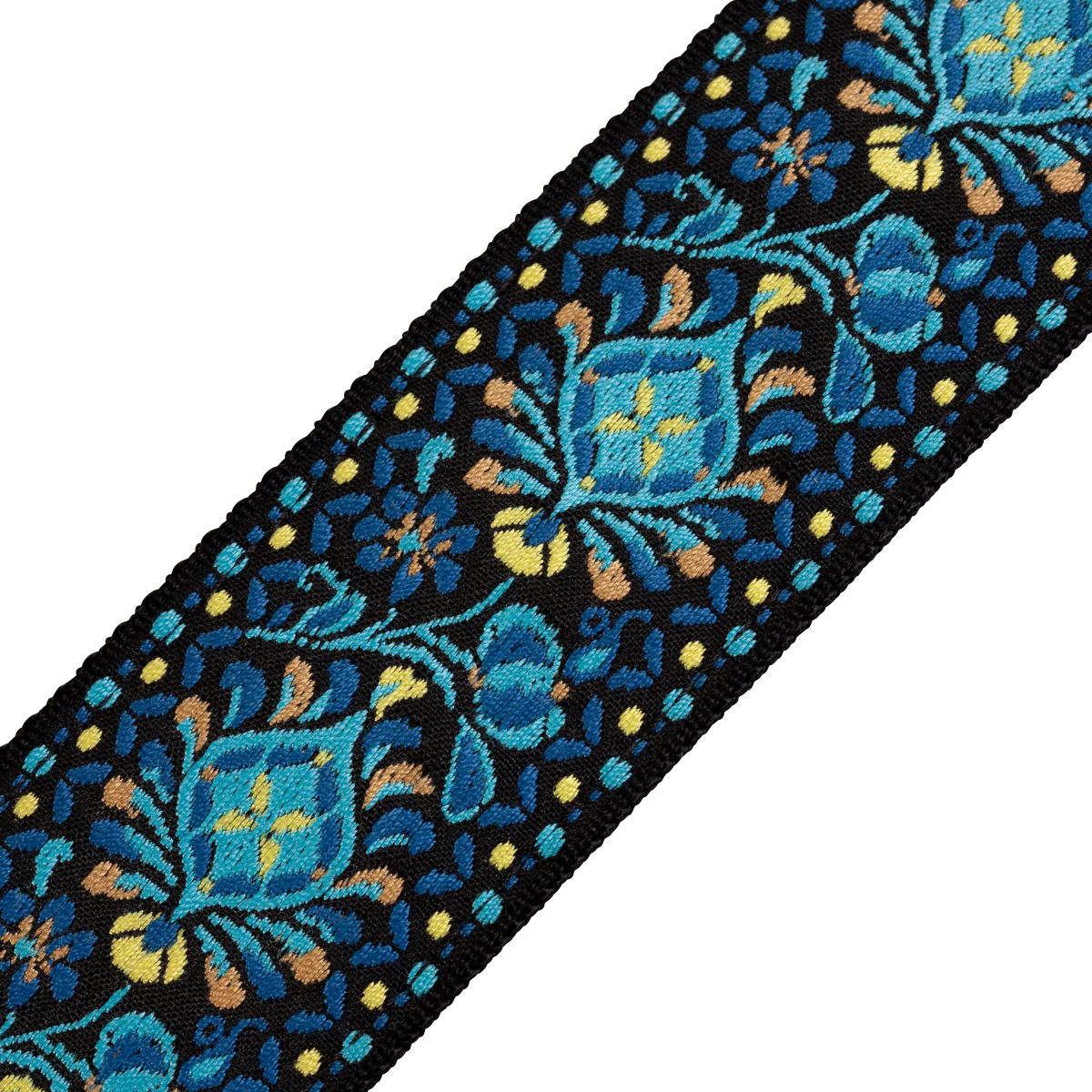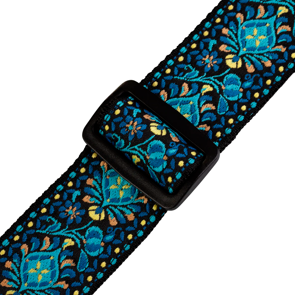 - Correa de guitarra tejida de 2” con motivo floral azul y amarillo