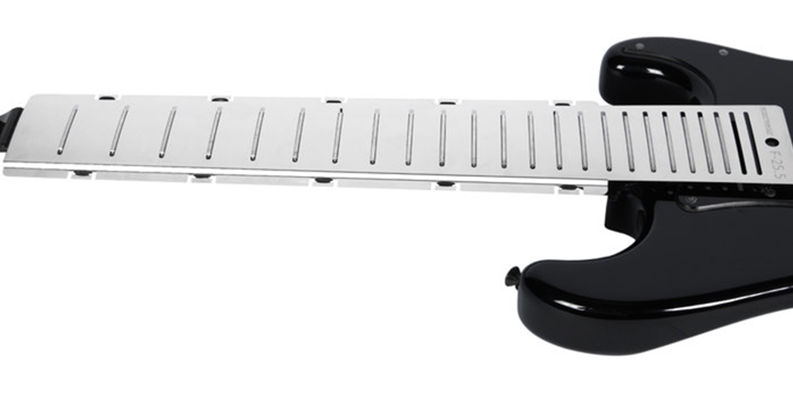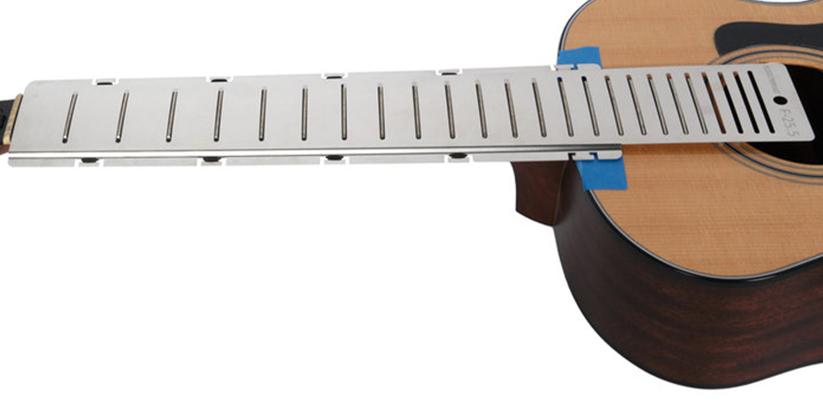 Protección total del diapasón en una escala de trastes de guitarra de 25,5″ hasta 24 trastes. Diseño de acero inoxidable y bordes desplegables de goma de alta calidad con grosor perfecto de 0,008″ (0,20 mm) con diseño cónico con tamaños de ranura que miden desde el primer traste 0,125″ (3,18 mm) de ancho x 2,075″ (52,715 mm) de largo hasta el último traste 0,125″ (3,18 mm) de ancho x 2,516″ (63,916 mm) de largo y se adapta a todos los tamaños de traste (desde estrecho a jumbo) que se encuentran en guitarras de 6 cuerdas.