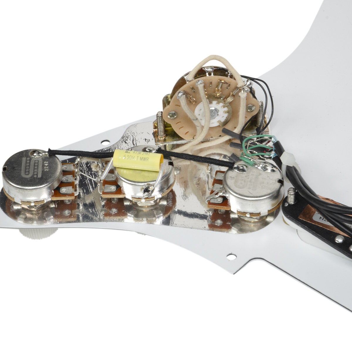 La mica Stratocaster YJM Fury Loaded está listo para colocarse en tu Stratocaster con un patrón americano de 11 agujeros para tornillos. Esta configuración precableada incluye un set calibrado de pastillas exclusivas YJM Fury y el potenciómetro de volumen YJM sin lubricación de alta velocidad que cumple con las demandas de velocidad y capacidad de respuesta de Yngwie. Estas pastillas hechas a mano se fabrican y cargan en las micas en Santa Bárbara, California. El modelo de puente está diseñado para manejar el ataque de cuerdas de Yngwie y ofrece una respuesta precisa y articulada que tiene la cantidad justa de agudos sin sonar áspero o quebradizo. El modelo de puente se embobina más apretado para proporcionar un mejor equilibrio con las pastillas del brazo y del centro. Los modelos de brazo y central están diseñados para resaltar el equilibrio de la técnica fluida de la mano izquierda de Yngwie con su amplia combinación de ataque de púa de la mano derecha para un tono dulce y suave. Tiene la cantidad justa de high-end para hacer que esta pastilla sea extremadamente articulada y especialmente receptiva a la dinámica. En los años 80, patentamos una bobina inferior especial que en realidad inyecta zumbido negativo en el circuito de captación y al final del proceso de producción y ajustamos cada captación para lograr la máxima cancelación de ruido. Obtienes todas las grandes cualidades de una pastilla Stratocaster clásica y nada de zumbido con nuestras pastillas Stack.