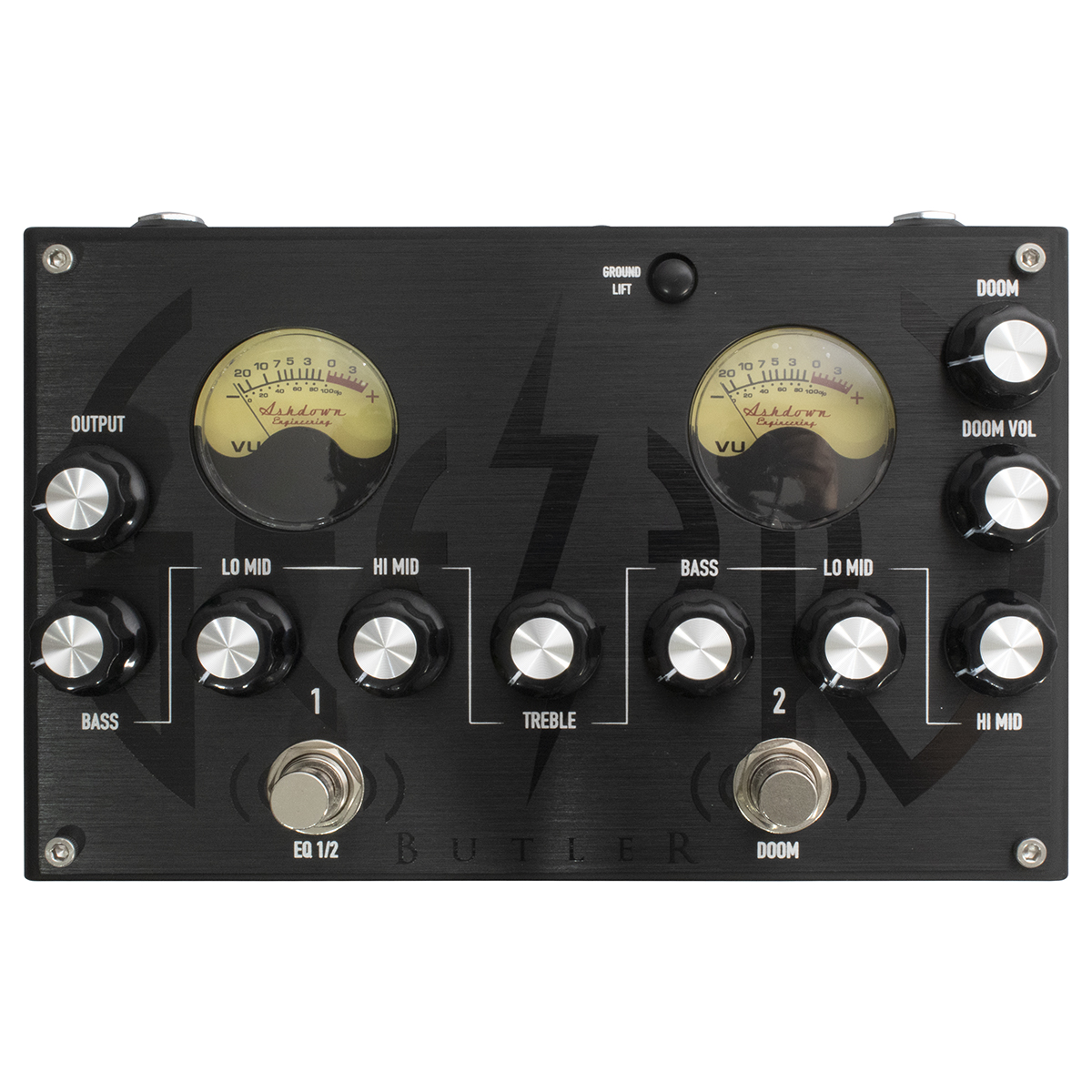 Pedal Signature Geezer Buttler de Doom con ecualizador dual VU y unidad drive conmutable.