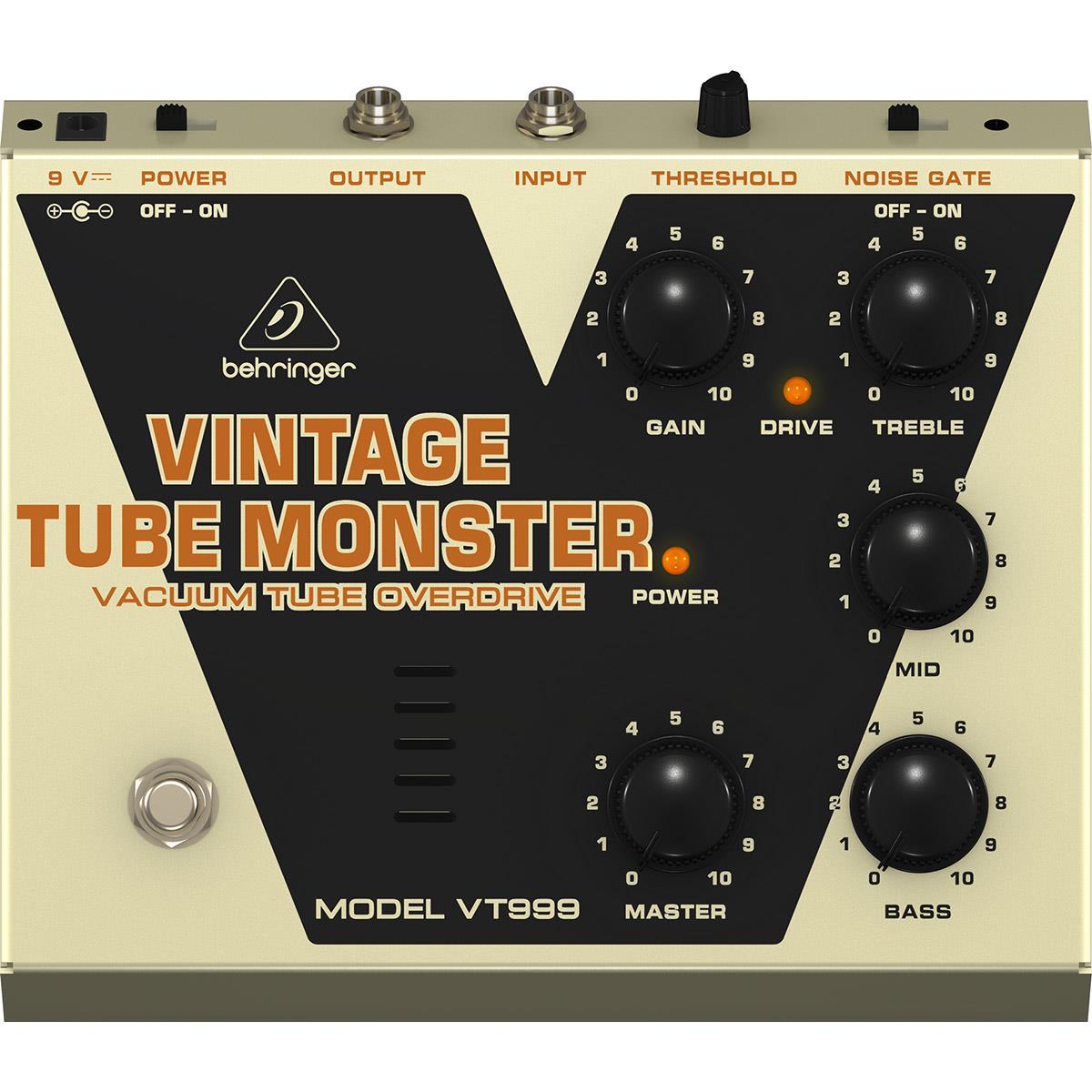 Pedal VINTAGE TUBE MONSTER VT999, basado en el sonido del bulbo 12AX7, consigue un amplificador de bulbos en un pedal y despega desde un cálido overdrive de blues hasta una distorsión heavy, Noise Gate integrada y conmutable con Threshold ajustable que mantiene tu sonido libre de ruido, controles dedicados de Gain, Master y ecualizador de 3 bandas para una formación formidable del sonido, LED de estado para activar y desactivar el efecto, True hard-wire bypass para una gran integridad del sonido, dimensiones: 61 x 220 x 172 mm, peso: 1.37 kg, incluye eliminador de corriente.