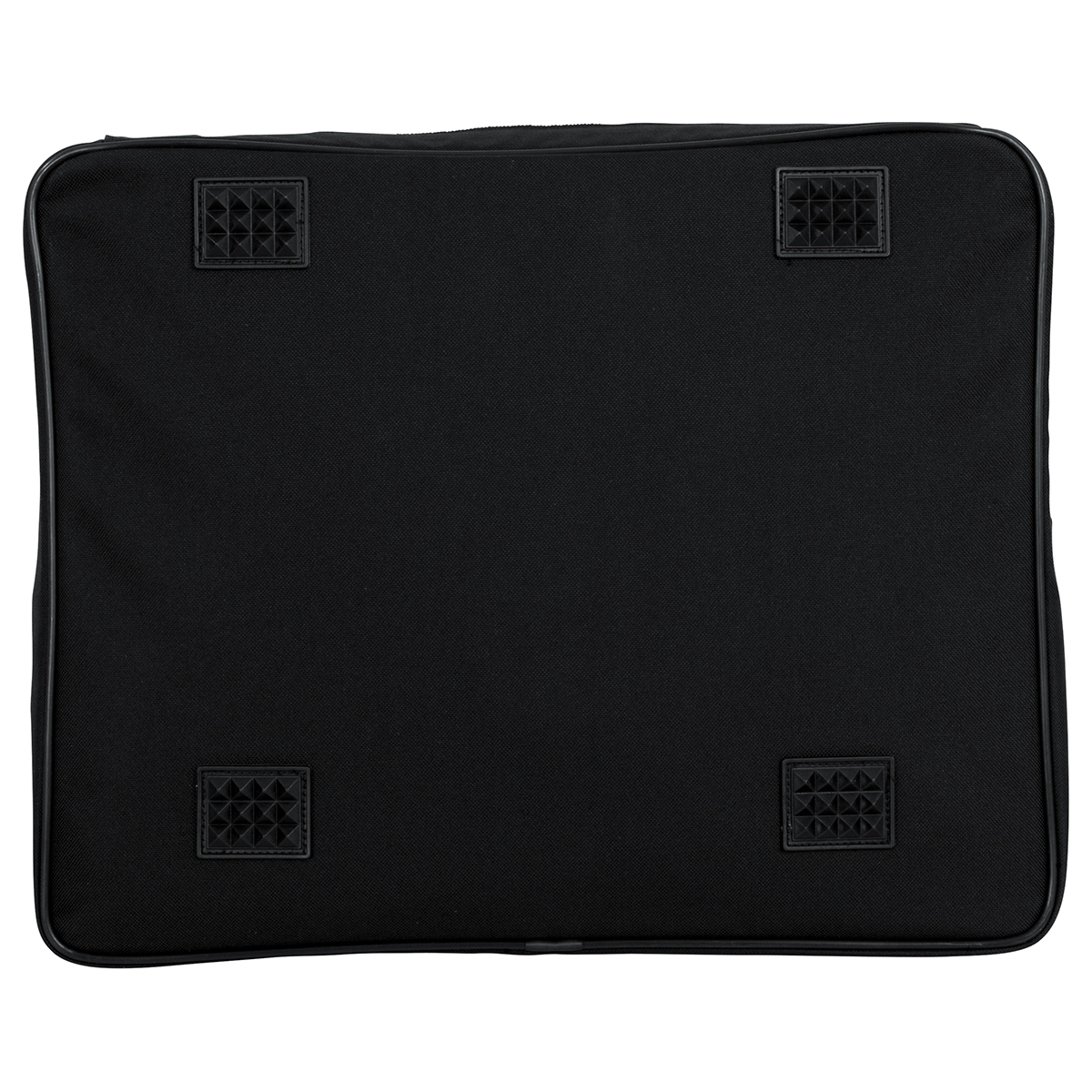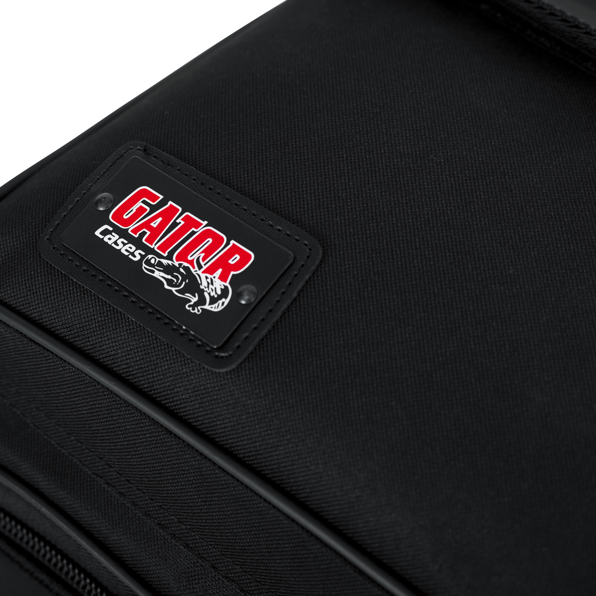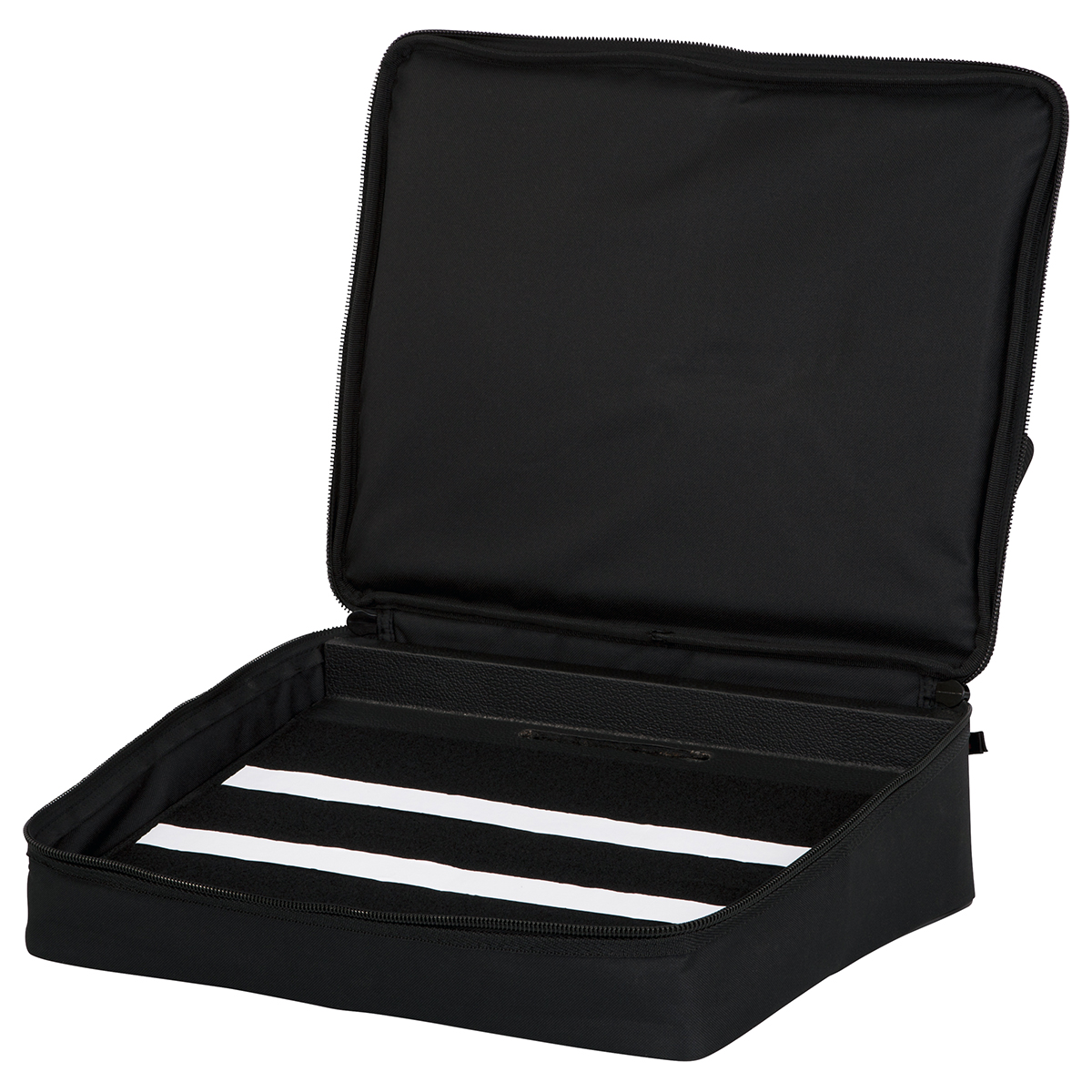 La pedalera GPT-BLACK de Gator mide 16.5″ x 12″ pulgadas, está fabricada con madera contrachapada cubierta de látex, cuenta con un asa de transporte que se desliza en un estuche de transporte acolchado de nylon resistente, orificios de acceso para cables, bolsillo exterior e incluye velcro para sujetar los pedales.