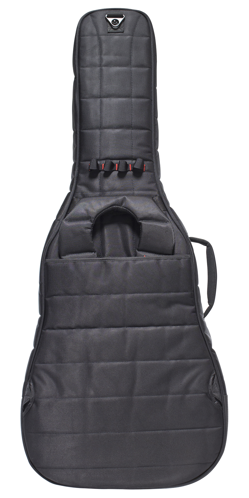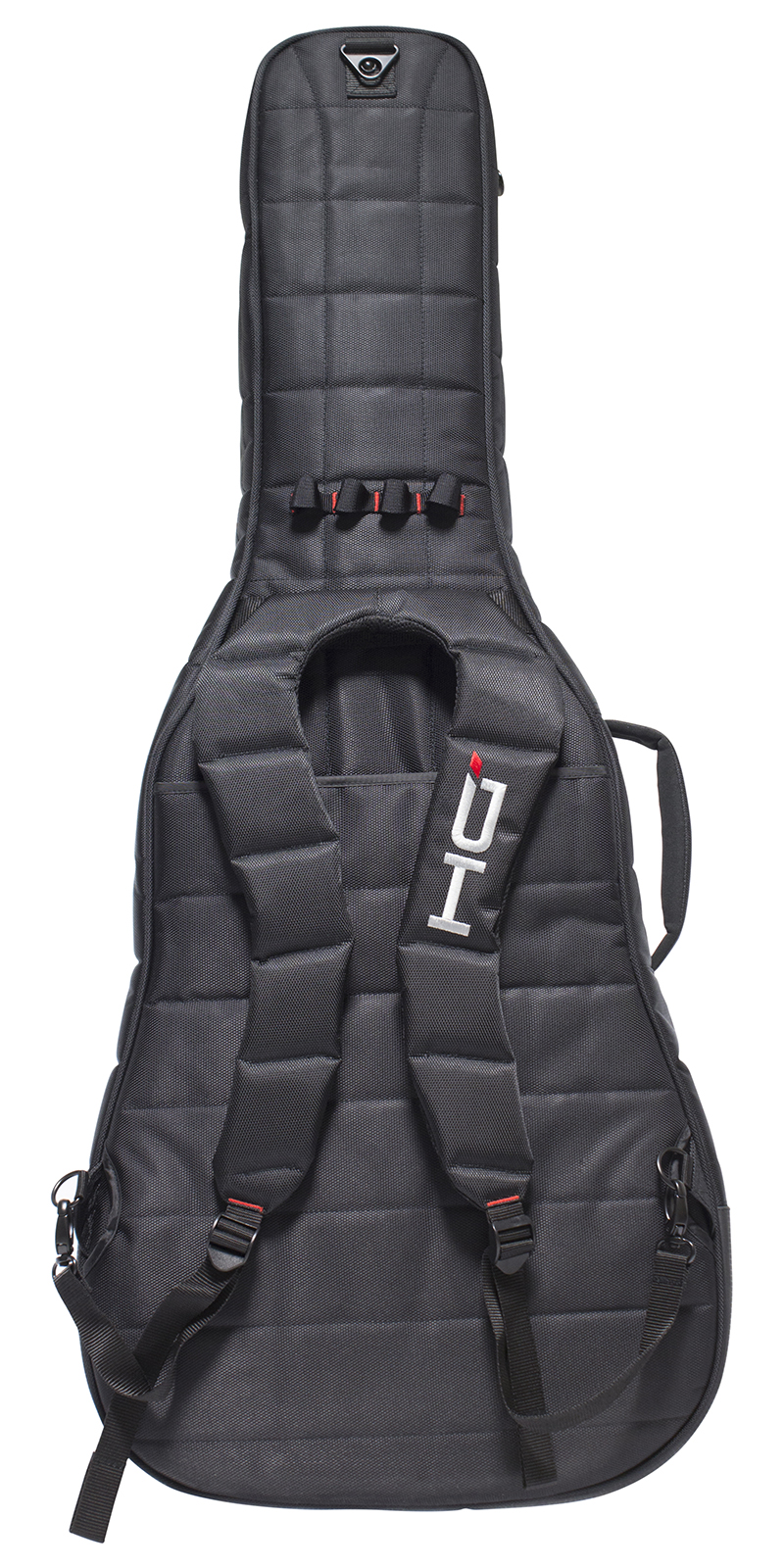 Funda para guitarra acústica, serie ARMOR, fabricada con nylon 1680D resistente al agua, correas traseras acolchadas y retráctiles ajustables con ganchos metálicos, cómodo mango de malla de espuma, suave forro interior de terciopelo con protección adicional cosida para puente y mecánica, grandes bolsillos frontales con varios compartimentos para libros de música, tablets, cables y accesorios, tiradores de cierre DH de aluminio fundido reforzado, acolchado DHFOAM de 35 mm.