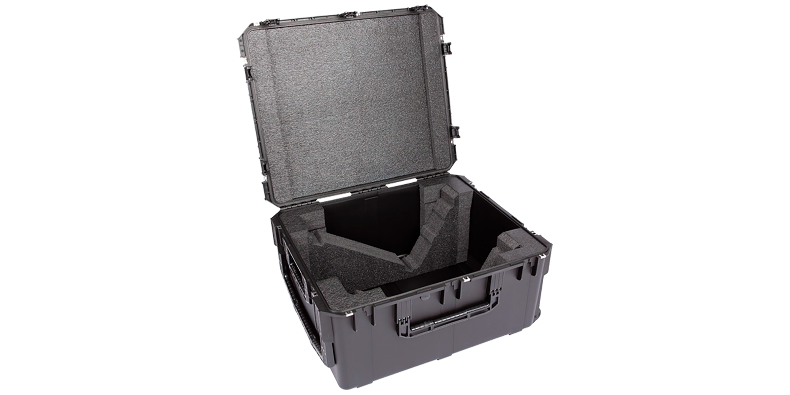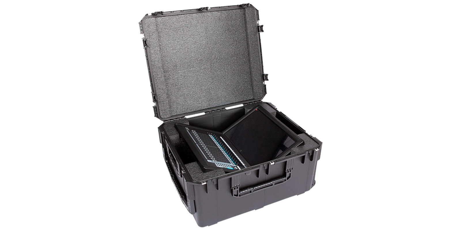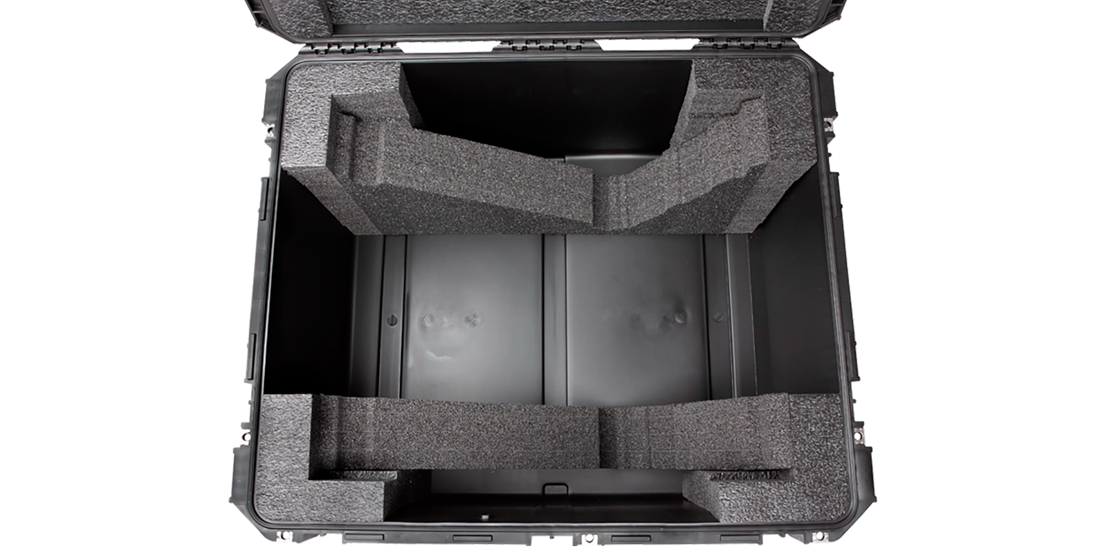 Su interior de espuma personalizada permite un ajuste perfecto de la mezcladora, mientras que el espacio inferior de 30” × 12.625” con altura variable de 1” a 10” proporciona almacenamiento adicional para accesorios esenciales como micrófonos cuello de ganso y cables.